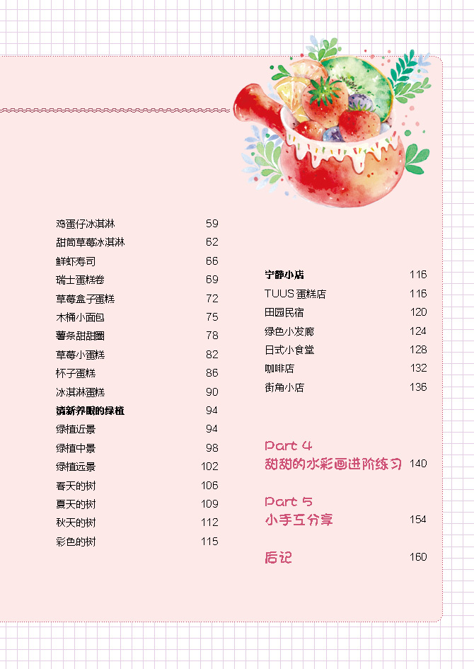 本书立足目前畅销技法书的水彩细化分类,用甜美的色彩来绘制生活中常见的美好事物,读者速成学会后,利用率很高,可做明信片、休闲手账、贺卡送礼、海报绘制等用途。书的内容共五部分,分别是初遇水彩、新手入门小秘笈、六步画出甜美小画、水彩进阶练习和小手工分享。书中不仅讲解实用的技法教程干货,更有作者的绘画思路与心得等方法论,案例步骤简单清晰,包含文字、配色、技法要点,读者短时间练习绘画便可获得成果。课程选例丰富,风格甜美,色彩清新亮丽,具有代表性与时代感,是一部既有学习实用性,也有观赏收藏性的水彩绘本。