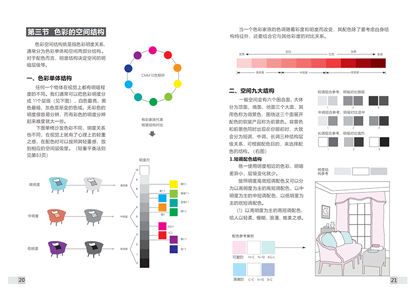 本书是针对新人室内设计师学习软装配色的一本通,全书分为四章,第一章主要介绍色彩的基础认知,包含无彩色系配色、有彩色系配色、色彩的空间结构、色彩的情绪、色彩冷暖等,第二章讲配色法则的实战运用,包含配色逻辑法则黄金比例法则、同频配色法则、呼应配色法则、平衡配色法则、突显法则。第三章介绍色相型配色的原理和实战运用,分别从素美配、自家配、 邻里配、远亲配、撞色配、多色配方面来解讲。第四章主要是讲如何搭配出打动人心的配色,包含色彩印象与配色的关系、找到你心中的喜好色和喜好色分类及分析、空间色彩定位、如何制作配色情绪板、配色的多种可能、九宫格印象配色及九宫格印象连接形与质。最后是配色训练,结合每章节的知识点,为读者提成课后练手。本书不但标明各种色彩的色值,还在重要的小节后安排了配色的涂色练习作业,有兴趣的更可以把配色作业上传到作业的微信,作者更可进行点评指导,该书立足于理论与实践相结合,使读者获得立杆见影的效果。