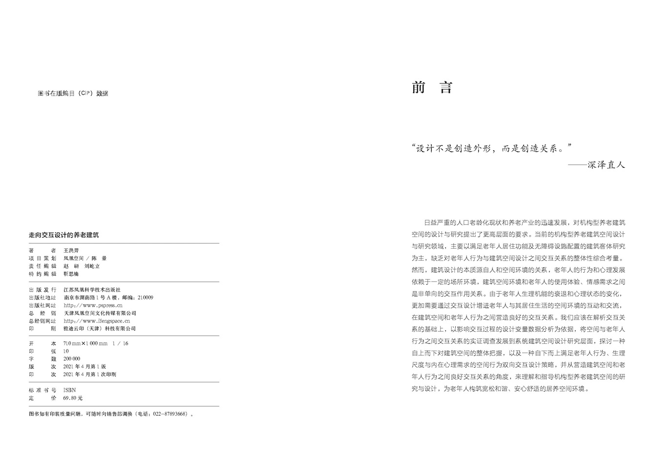 本书共分为六章:第一章,老龄化背景、养老福祉政策与养老建筑类型体系,介绍并比较世界各国养老保障政策与相关设施的建设情况,探讨养老建筑交互设计的目的和意义;第二章,养老建筑交互设计理论,科学界定交互设计概念,分析世界各国交互设计现状;第三章,养老建筑交互设计对象,详细分析交互客体对象(建筑空间);第四章,养老建筑交互设计过程,详细分析交互过程中老年人与建筑空间的相互影响;第五章,养老建筑空间与老年人行为的交互设计模式与策略;结语。