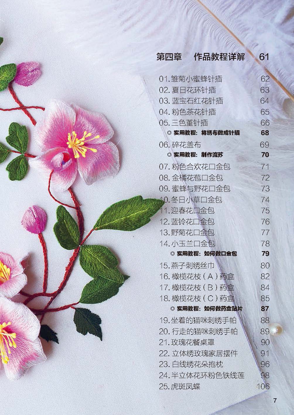《刺绣入门 森系立体实用刺绣小物轻松做》本书一共分为四个章节的内容,第一章刺绣成品展示,第二章 工具及材料 ,第三章 刺绣基础针法,第四章 作品教程详解。玫瑰花餐桌罩、 立体绣玫瑰家居摆件、 白线绣花朵抱枕、半立体花环粉色铁线莲、虎斑凤蝶。刺绣和绘画一样,都可以用作品来表达思想,传达感受和情绪,只是表达的情绪不同。刺绣是一个学习美与创造美的过程。让我们一起用针线来表达对美的感受吧 !在技艺精湛的基础上,好的刺绣不仅仅是比机器制作的精美这么简单,而且要具有手作的味道。从选材到细节的精益求精,这是手作人应有的态度和信仰。如何使作品具有生命,这就是好与更好的区别。我们带到作品中去的,是所有读过的书、看过的电影、听过的音乐和爱过的人,是具有温度的、拥有创作者气质的、与众不同的礼物。多多观察就会明白其中的道理。这听起来很奇妙,但事实的确如此。