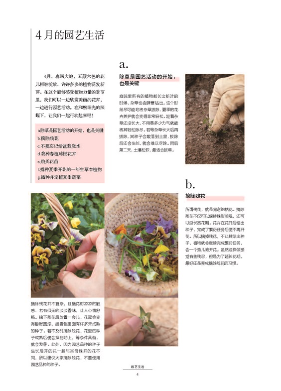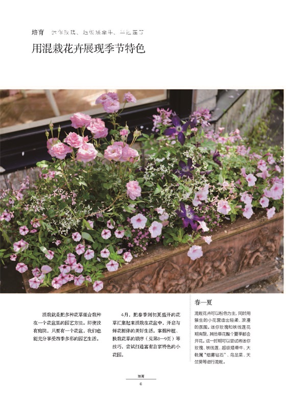 本书按照月份分为12个章节,涵盖了每月易栽植物推荐、植物养护、庭院景观设计、植物配色等方面的内容。此外本书还加入了培育、装饰、料理三个主题,希望大家将园艺活动的成果从户外带入室内,过上花草为伴的诗意生活。每章开篇部分推荐了当月花期的十多种植物,介绍了植物的花期、栽培方式、科属等基本信息;随后的部分按步骤细致讲解了每月需要进行的园艺活动,如果换盆翻土堆肥的技巧或者庭院景观设计和植物搭配的小妙招;第三节以某一类代表性植物的培育要点为主要内容,例如香草类植物的栽培和养护、球根类植物的培育技巧等;第四节教读者将植物运用到生活中,如各式花卉的插花花束制作、香料助眠枕的缝制等;第五节希望读者在劳动之余也能有口福之享,介绍了多种可以用自己庭院植物制作的菜肴或茶饮。本书结尾处,编者贴心总结的园艺生活日历可以帮助大家合理有序地开展园艺活动。