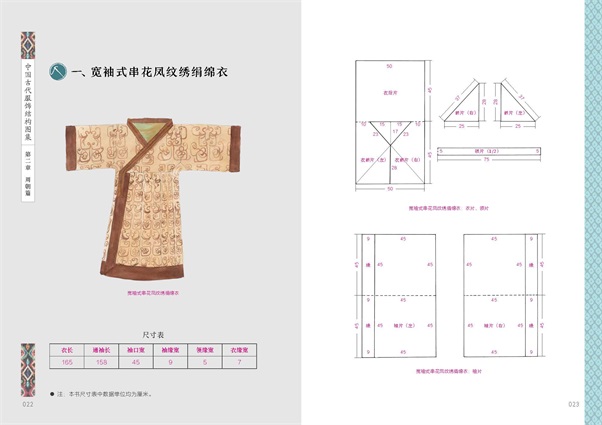 书中每件服饰均为作者手绘,并给出涵盖衣长、通袖长、袖口宽、领缘宽、袖缘宽、裙宽、裙长等的尺寸表,以严谨的版型、数据展示每件衣服的前后片、左右片、袖片、裙片、领片、系带等,各处细节尺寸标注详细,裁剪线、对折线、缝纫线清晰,按图裁剪、制作即可。介绍了裁剪、量体以及所需布料如何计算的方法,为古代服饰制作者、设计者、研究者、爱好者提供了较为详尽的参考资料。