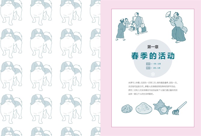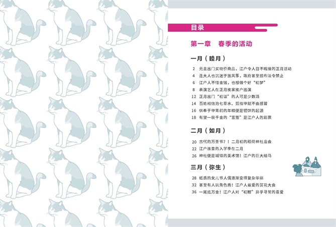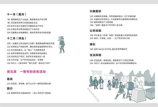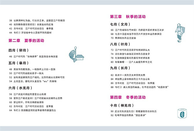 该书以日本江户时代为背景,介绍了日本古代人的饮食起居、节日庆典、娱乐方式等。全书共分为五个章节,第一章介绍春季的三个月,内容包括日本古人过年的仪式和习俗、日本古人对时令海产和农产品的喜爱等;第二章来到盛夏的三个月,介绍了日本古人的夏季生活,如何进行衣物换季、男孩节升鲤鱼旗的习俗渊源、江户城内盛大的山王祭等;第三章为秋季,介绍了日本人祭祖的节日盂兰盆节、神田祭的花车游行等;第四章则介绍了日本江户时代人冬季的生活,古时日本的酿酒业分布、迎接新年的准备等。第五章通过五个具有代表性的方面来展现江户文化,分别为日本传统戏曲、江户人的旅行、兴趣爱好、公共设施、娱乐方式。
