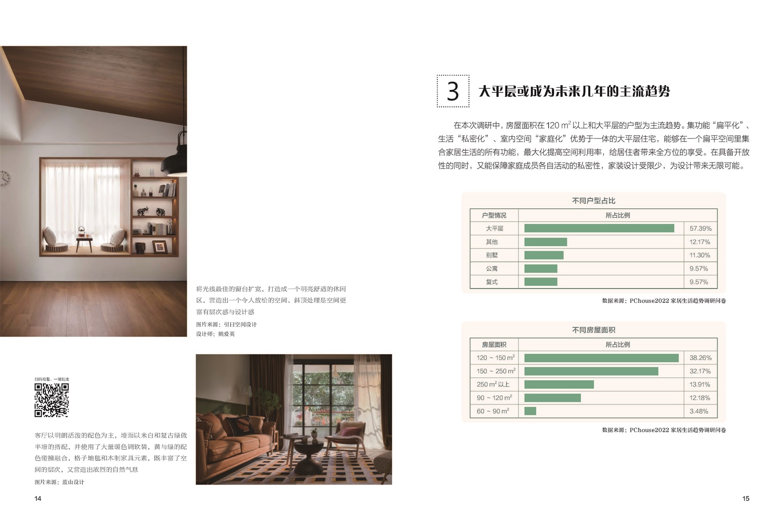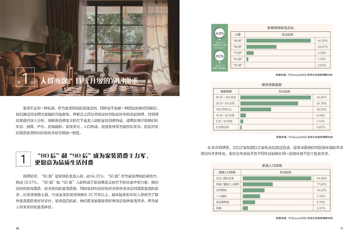 在新消费主义盛行的今天,人们越来越关注于生活的品质、居住的乐趣。为了探讨多元化消费形态下,大众对家居消费呈现的全新趋势与需求,找到不同生活方式下的人们享受生活的空间形态,看到在这个时代里人们对于居住品质、对生活、对美的追求。PChouse太平洋家居网携手十多位行业顶级名师,并联合超百位精英设计师以及设计机构参与制作,立足并聚焦于当代中国家庭生活研究,展开了面向未来的家居生活趋势研究,旨在通过大数据的分析与真实案例样本的解读,洞察不同消费群体的需求和市场趋势,以数据的名义解读生活方式的差异,从不同视角展现当下多元价值观下的多彩生活。