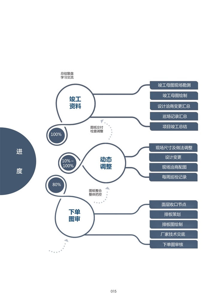 深化设计是装饰工程项目中的重要环节。其内容是在各专业设计资料提供现场,完善技术图纸、现场技术指导,协调配合各专业单位,减少项目不必要的成本与工期浪费,保证落地质量与效果满足业主要求,充分发挥项目从设计到落地的“中场发动机”作用。