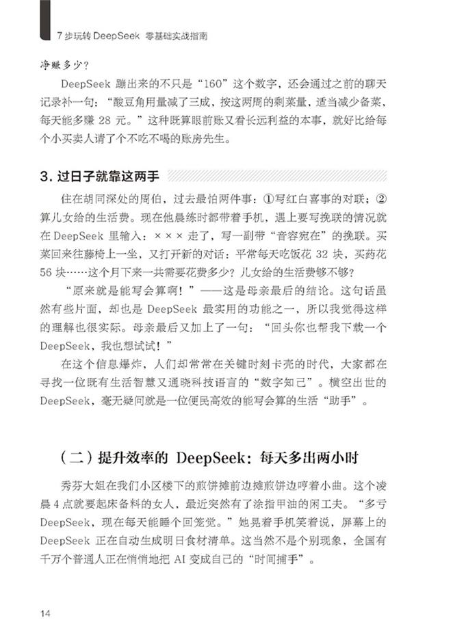 书中的“角色扮演提问法”“连续追问技巧”等进阶秘籍,将助你突破普通用户的认知边界,成为真正的AI协作高手。翻开本书,让DeepSeek智能助手为你每天多赚2小时!