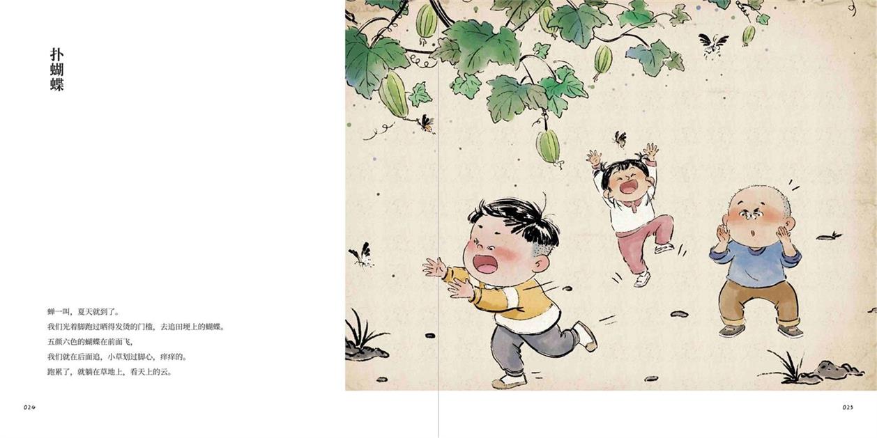 本书《纸鸢飞过,我们仍是孩子》是一部以童年记忆为主题的图文创作集,全书围绕童年生活的美好片段展开,分为“岁时记”“旧物志”“好伙伴”“念亲恩”四卷。“岁时记”以四季为序,细腻记录不同时节中的童年乐趣:春天“一脚踩进溪水抓蝌蚪,把心里那点皱巴巴游得平平展展”;夏日有“老蒲扇摇出的懒洋洋的风”;秋天是“摘柿子时那一跳一跳获取的甜”,冬日的味道则藏在“烤红薯金黄的瓤里,一寸一寸暖透身体”。这些文字与画面共同编织出童年与自然相亲的质朴欢愉。