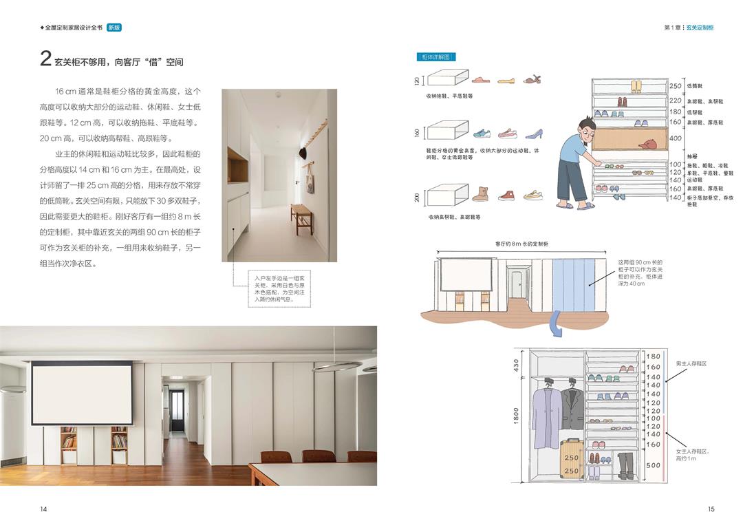 300+手绘插图,轻松活泼,降低理解门槛,玄关、客厅、厨房、餐厅和卧室等空间定制柜设计详解,将定制柜设计与空间属性紧密结合。