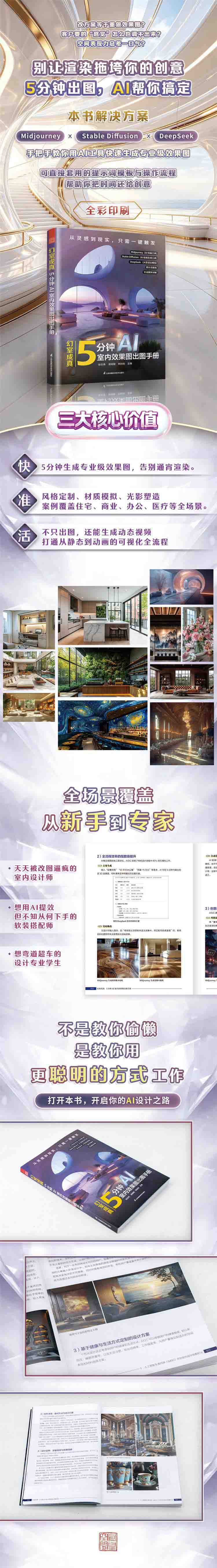 书中介绍midjourney、stable diffusion、deepseek等主流ai工具的使用方法,包括提示词构造、模型设置、图生图功能及智能检索等。通过住宅、公共空间、办公场所等大量案例,展示aigc在风格定制、材质模拟、光影塑造等方面的应用。
