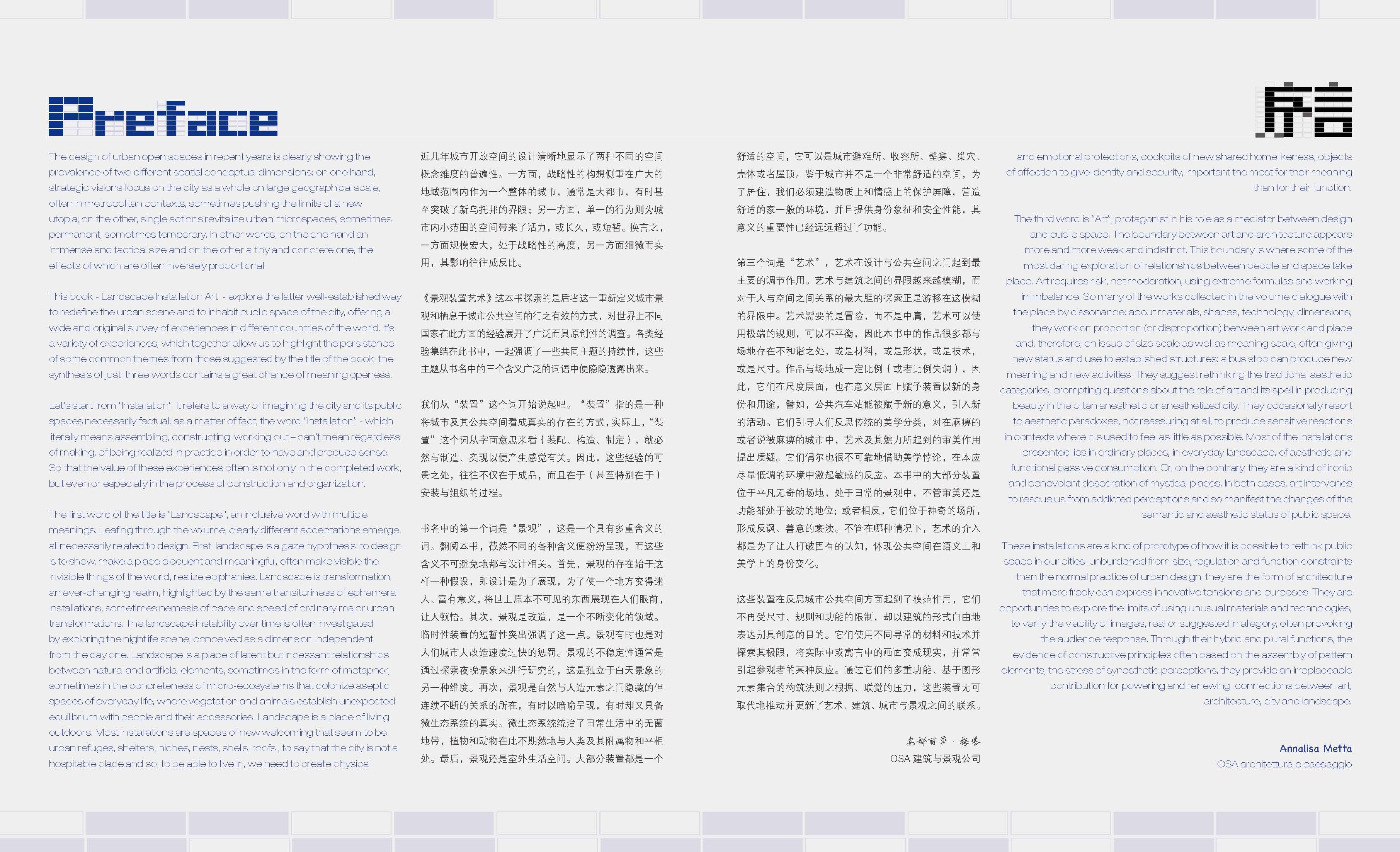 This book includes 79 excellent landscape installation artworks. Through showcasing high resolution images with detailed text descriptions, this book presents the world’s latest and most creative landscape installation artworks. There are plenty of sketches and other detailed drawings to help the readers better understand the ideas of the artists and the construction process. At the end of the book, there are 25 more projects that are showcased through QR code.