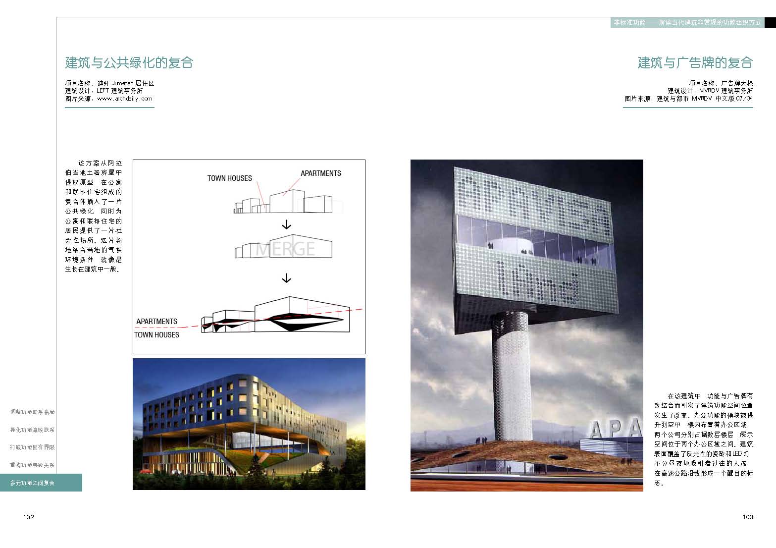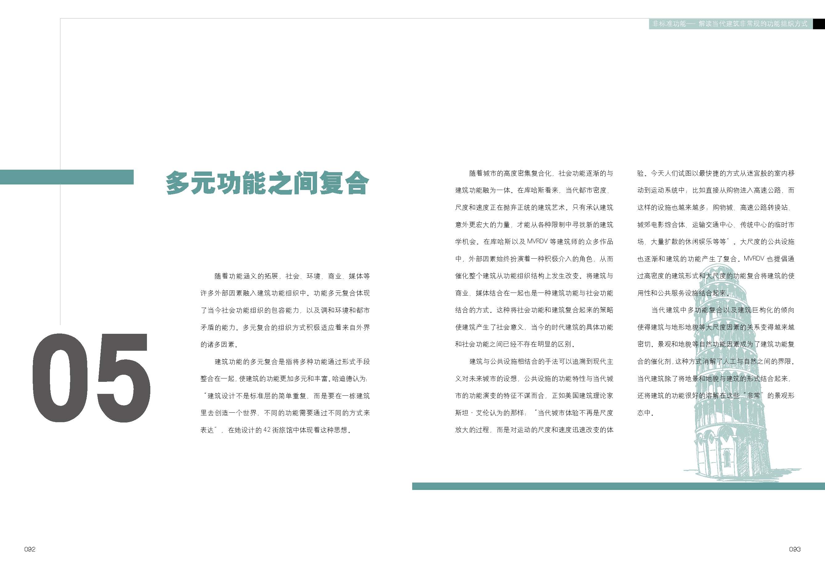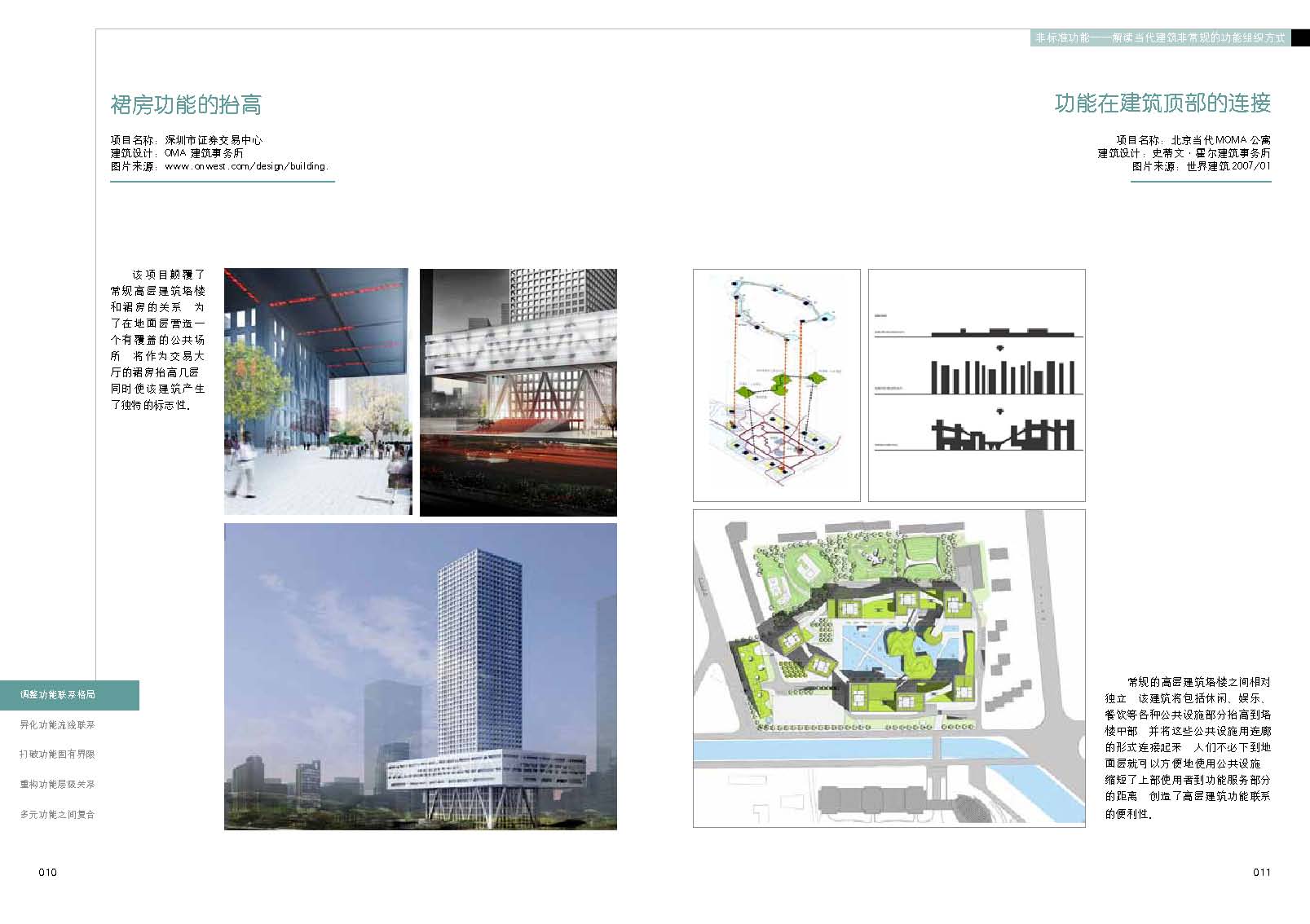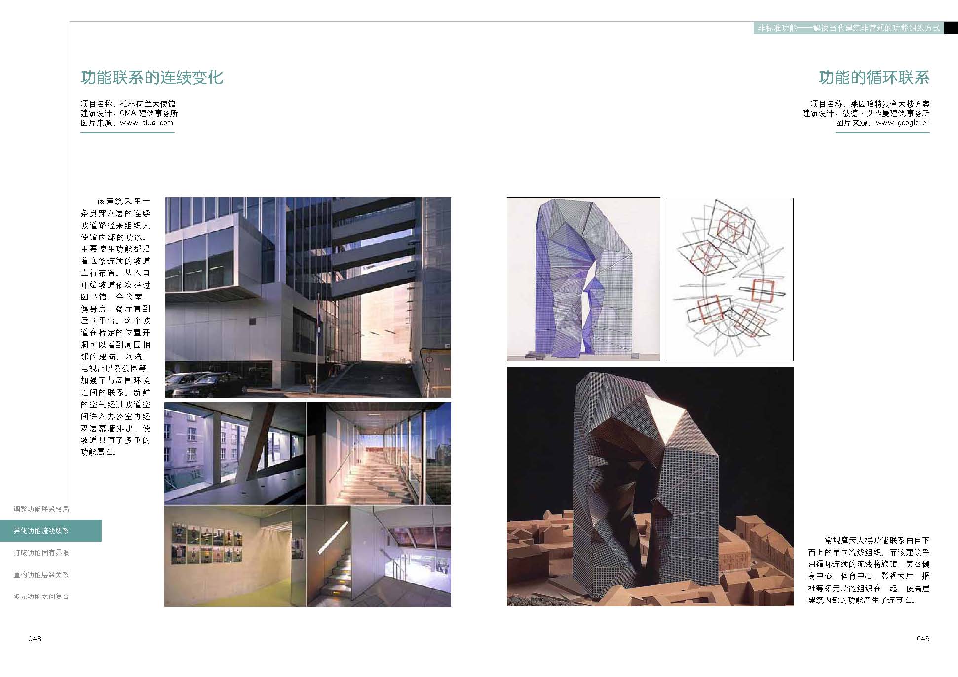 本书以功能组织相关领域的研究为基础,通过对当代功能组织方式创新的案例进行分析,用对比的方法揭示了这些功能组织方式的“非常规”的特征,归纳和提炼出非常规功能组织的一些基本手段,它们分别是:调整功能的空间格局、异化功能的流线模式、打破功能的固有界限、重构功能的层级关系以及强调功能的多元复合。本文进一步提出了这些非常规功能组织方式的适用领域以及现实意义,为我们审视当今建筑创作的创新机制和预测未来建筑功能组织的发展趋势做了铺垫。