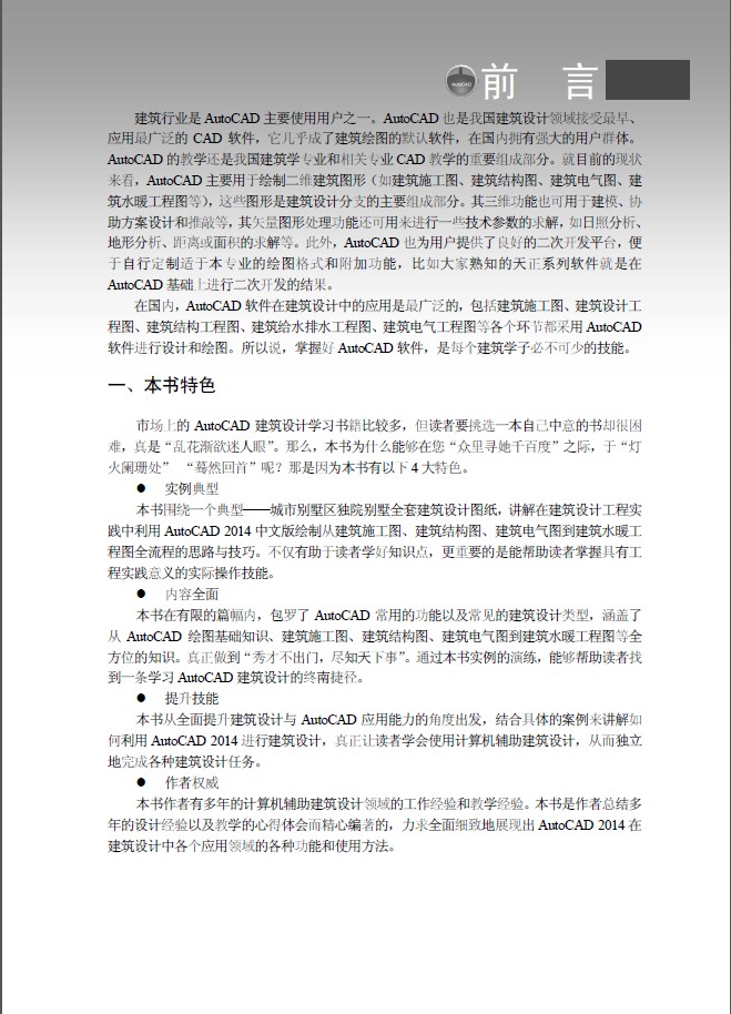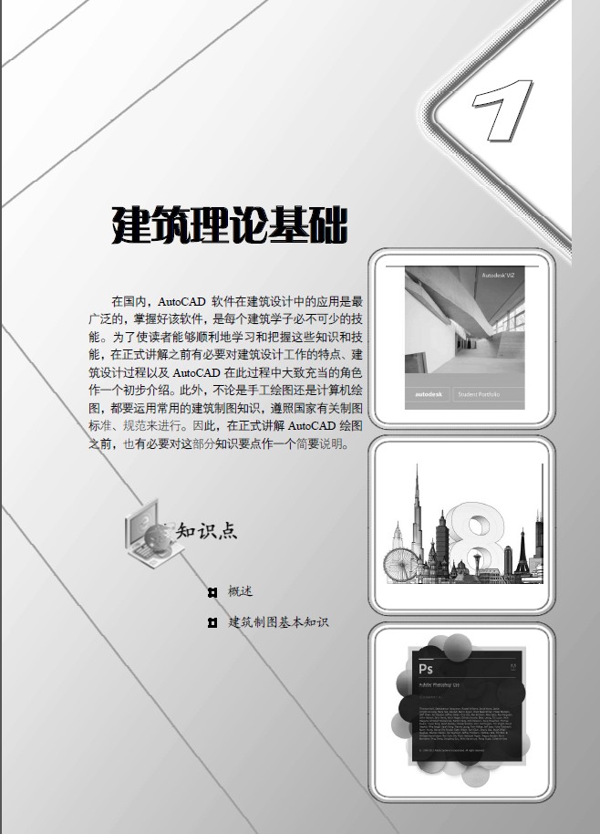全书共分五篇13章。第一篇为基础知识篇,其中第1章主要介绍建筑理论基础;第2章主要介绍AutoCAD基础。第二篇为建筑施工图篇,其中第3章主要介绍别墅平面图的绘制;第4章主要介绍别墅装饰平面图的绘制;第5章主要介绍别墅立面图的绘制;第6章主要介绍别墅剖面图的绘制。第三篇为建筑结构图篇,其中第7章主要介绍建筑结构设计概述;第8章主要介绍别墅建筑结构平面图的绘制;第9章主要介绍别墅建筑结构详图的绘制。第四篇为建筑电气图篇,其中第10章主要介绍建筑电气工程基础;第11章主要介绍别墅建筑电气工程图的绘制。第五篇为建筑水暖工程图篇,其中第12章主要介绍建筑给排水工程图基本知识;第13章主要介绍别墅水暖设计工程图的绘制。