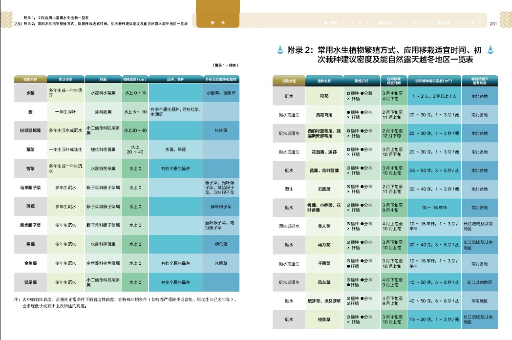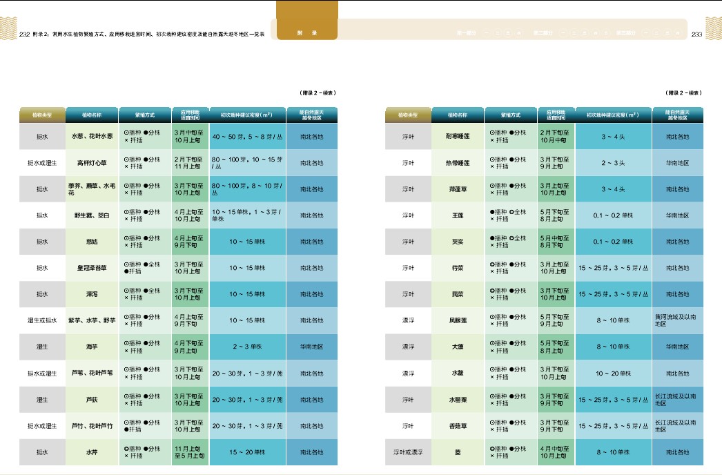 附录2 常用水生植物繁殖方式、应用移栽适宜时间、初次栽种建议密度及能自然露天越冬