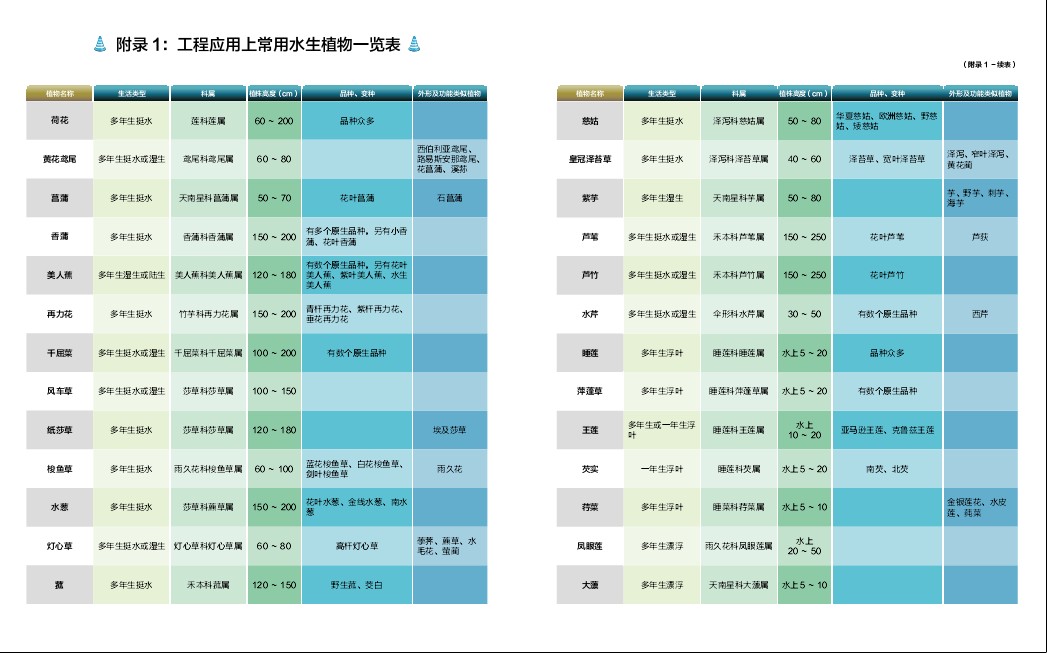 附录3 常用水生植物适宜水深、最佳水深及适应基质一览表