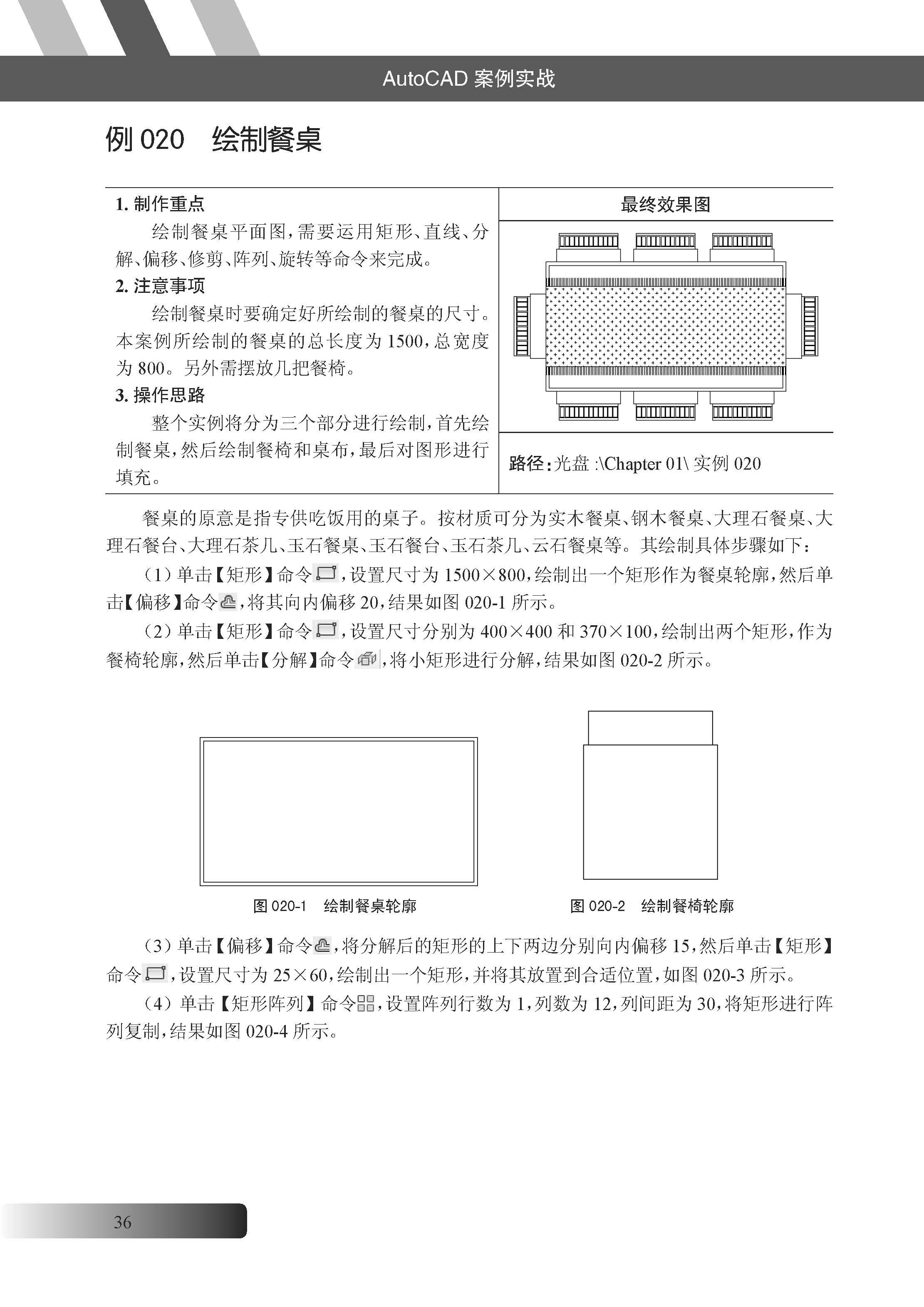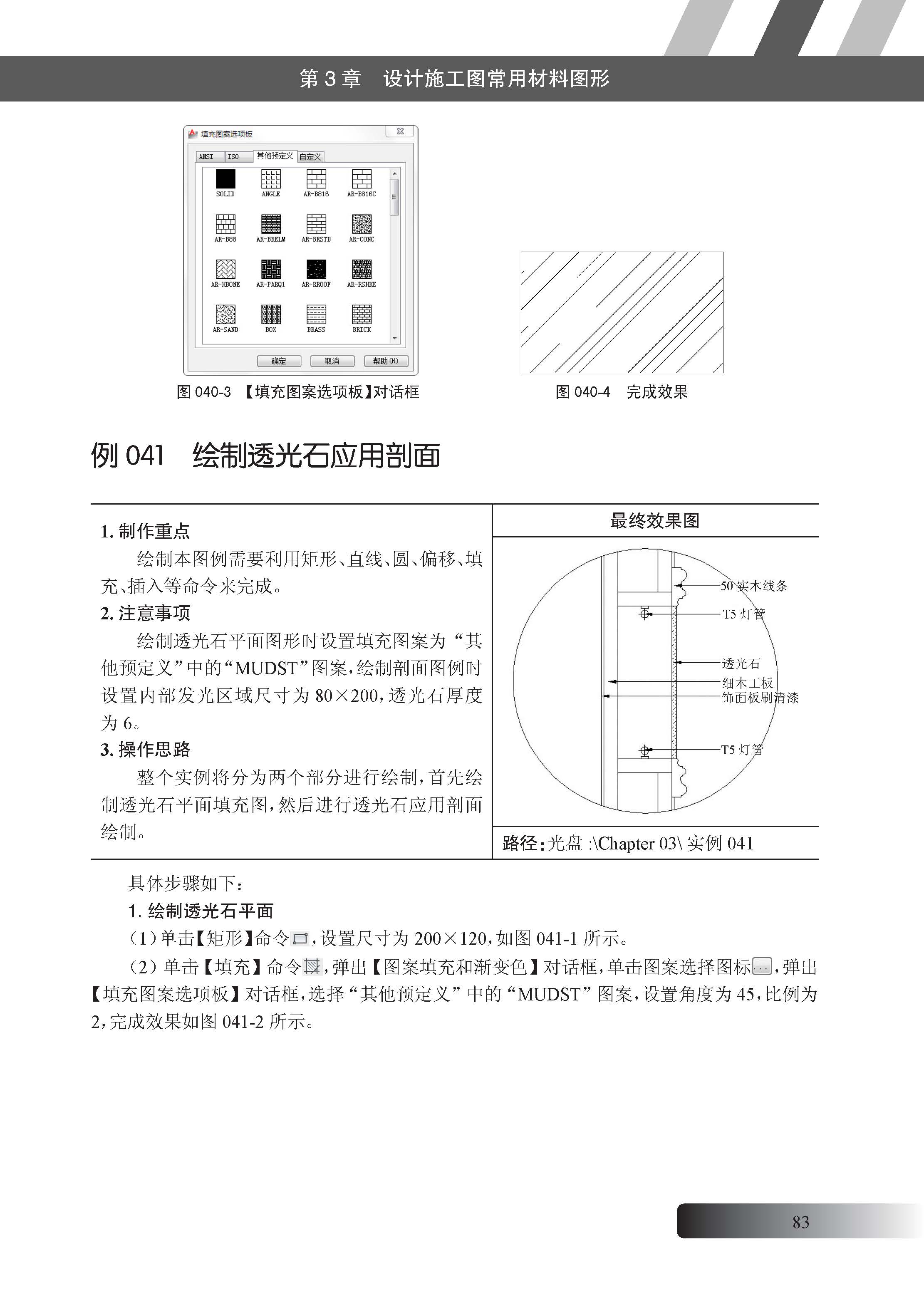 本书以建筑和室内设计制图为主,精心挑选了近200个案例进行讲解。全书共15章,主要内容有:设计家装施工图常用图形、绘制工装施工图常用图形、设计施工图常用材料图形、设计园林施工图常用图形、设计现代风格小户型图、设计简欧风格两居室图、设计现代风格三居室图、设计错层户型图、设计中式别墅图、办公空间设计方案、酒店客房设计、KTV包厢设计、餐厅设计、服装专卖店设计、绘制家具三维模型等。