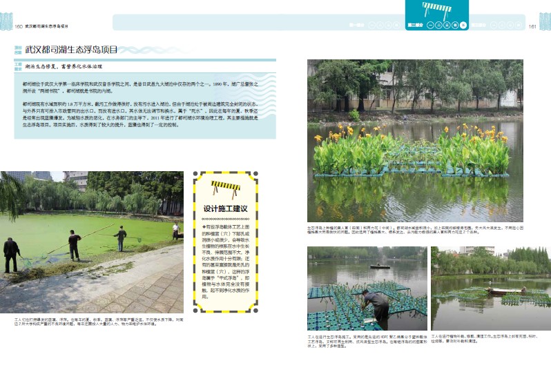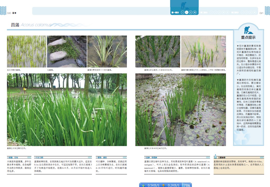 第二部分和第三部分均是结合大量实践应用案例进行分析和阐述,配有治理或施工前后、不同生长期的现场实景彩图,并用“施工心得”、“设计施工建议”、“工程反思”等形式重要总结水生植物在各个应用领域的实践技术和经验。“附录”部分是3个表格,以一目了然的方式介绍了水生植物主要应用品种的生物特性、品种类似种、繁殖方式、应用移栽时间、栽种密度、能越冬地区、适宜水深及适应基质等方面的参数或建议。
