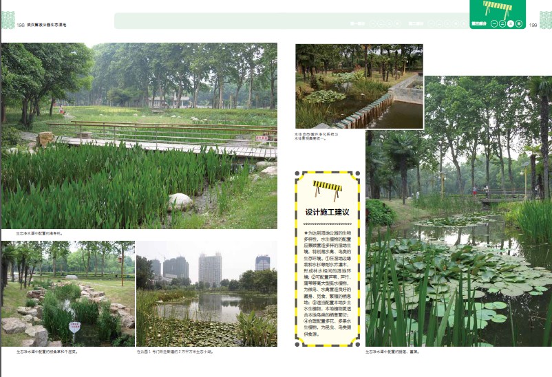第三部分“水生植物在水体景观中的应用”,细分为“小型水景”、“湿地公园”和“水生专类园”3个应用领域。