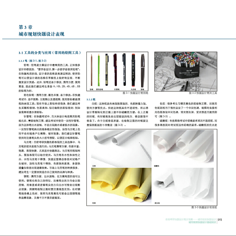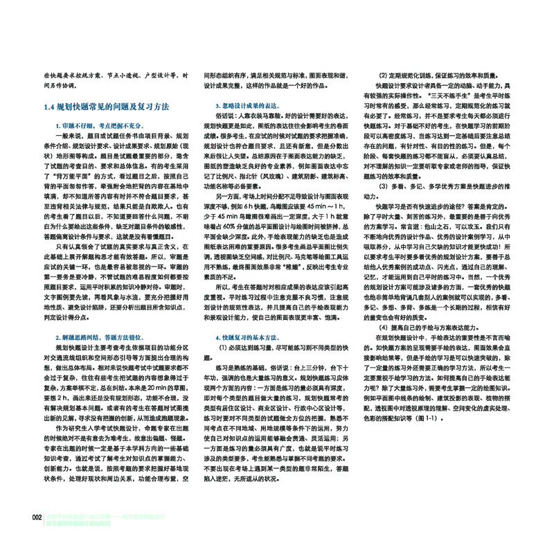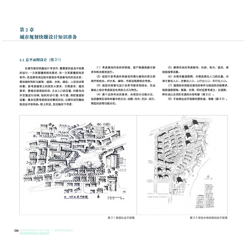 全书共4章,第1章是城市规划快题设计概述,介绍了城市规划快题设计的基本概念、基本类型、基本要求、内容表达、常见问题及复习方法。第2章是城市规划快题设计知识准备,从总平面图设计、建筑布局要求、主次入口的设置、交通与流线设计要求、停车场(位)设计、快题指标说明等方面入手,阐述了快题设计中需要注意的相关规范、规定与设计方法。第3章是城市规划快题设计表现,讲解了快题考试常用工具的分类与应用、图面设计与表现要点。第4章是城市规划快题设计案例浅析与点评,并对不同院校、不同类型的历年研究生入学考试的相关真题做了整理、归纳与浅析。