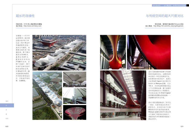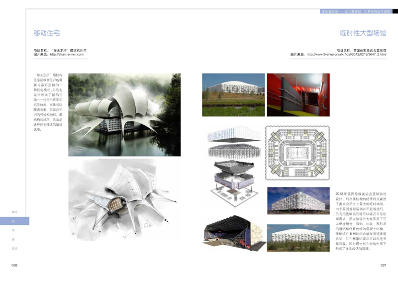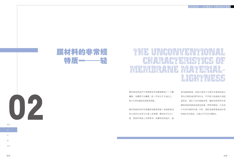 本书通过对国际优秀膜材料建筑案例进行分类、归纳、总结,用三个章节系统全面地讲述了膜材料的特质:轻、柔、弱,以及由此特质带来的各种可能性。根据这些作品的精炼而独到的简要分析,使膜材料从建筑领域跨越到其他领域,不断地革新、发展、飞跃,以此展望未来膜材料的建筑表现潜力。