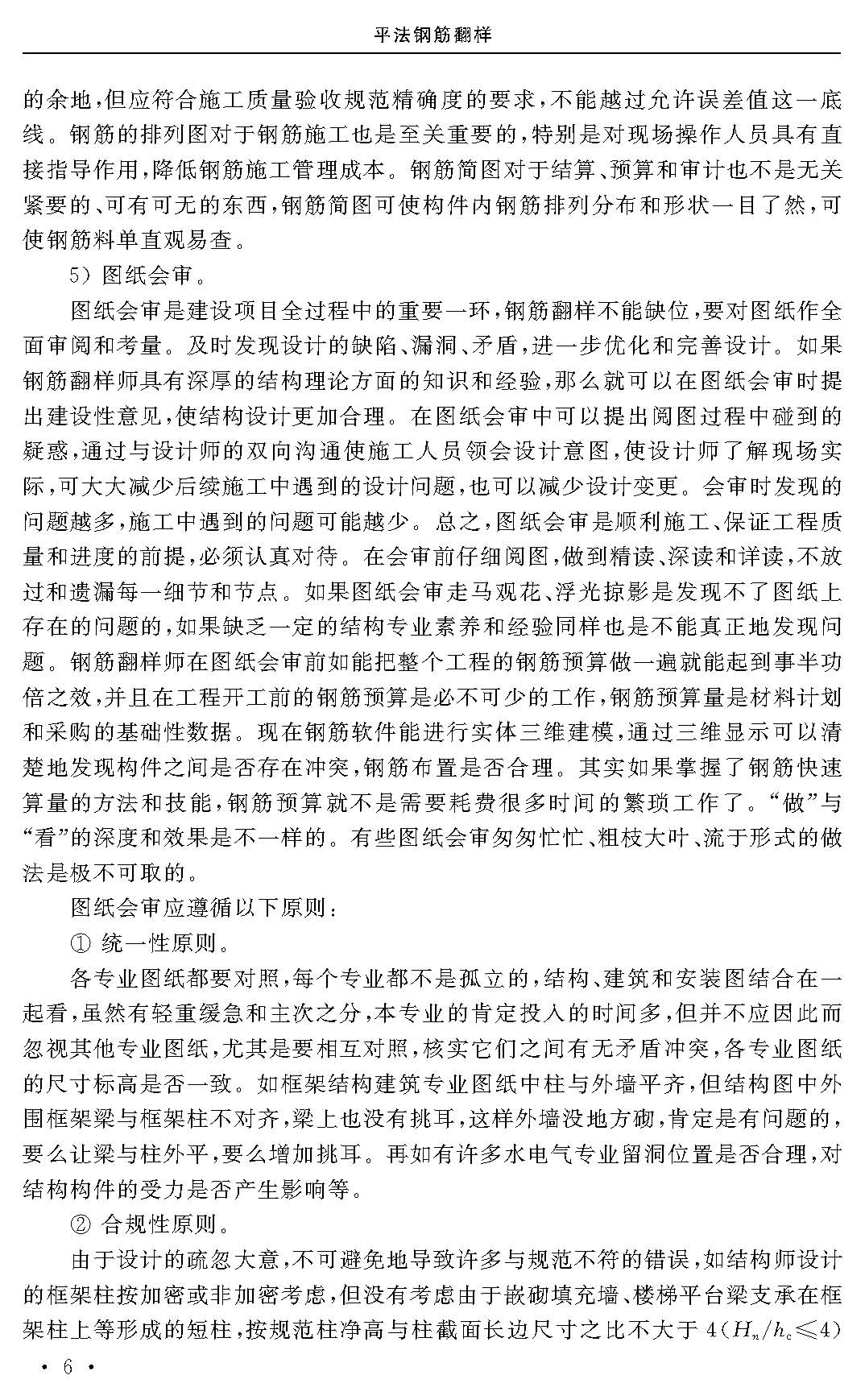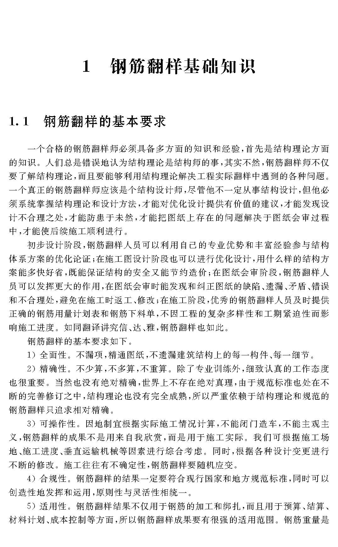 初步设计阶段,钢筋翻样人员可以利用自己的专业优势和丰富经验参与结构体系方案的优化论证;在施工图设计阶段也可以进行优化设计,用什么样的结构方案能多快好省,既能保证结构的安全又能节约造价;在图纸会审阶段,钢筋翻样人员可以发挥更大的作用,在图纸会审时能发现和纠正图纸的缺陷、遗漏、矛盾、错误和不合理处,避免在施工时返工、修改;在施工阶段,优秀的钢筋翻样人员及时提供正确的钢筋用量计划表和钢筋下料单,不因工程的复杂多样性和工期紧迫性而影响施工进度。如同翻译讲究信、达、雅,钢筋翻样也如此。