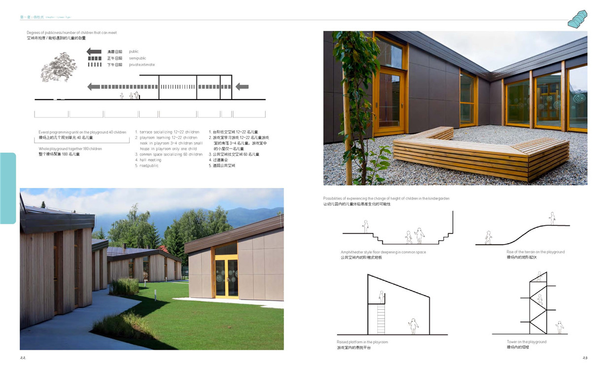 良好的学前教育不仅为人的发展奠定良好的基础,还有利于提高义务教育质量,促进社会和谐稳定发展。幼儿园不仅仅要照顾儿童的身体,还要承担起促进儿童发展、培养儿童个性的重任,使孩子将来能适应变化的社会。在这种状况下,对幼儿园建筑也会提出新的要求。因此,现代幼儿园建筑设计要想方设法创造一些趣味空间,对于那些边边角角的公共辅助空间,可以通过一些新奇的设计手法获得意想不到的空间效果。本书从幼儿园建造的选址、不同教育模式的幼儿园建筑形态、幼儿园建筑的新趋势等方面,以及近年出现的作品,来分析建筑师对这一问题的思考,其中的一些设计新趋势颇值得借鉴。