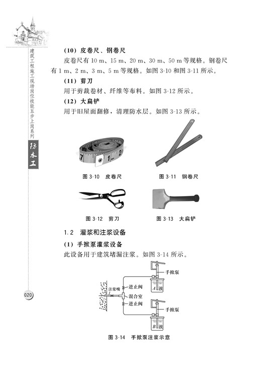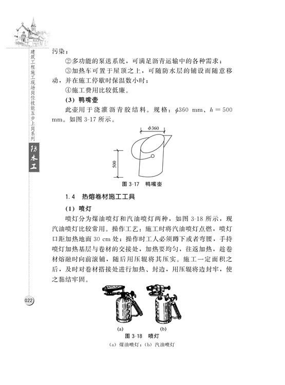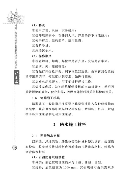 本书将防水工上岗分为五步:第一步——确保上岗资格;第二步——遵守行业规范;第三步——熟悉工具材料;第四步——掌握测量技术;第五步——保障施工安全。