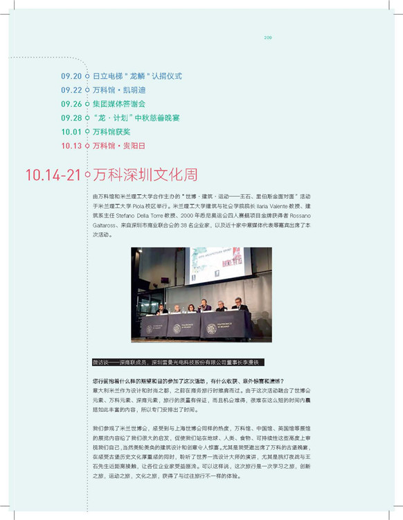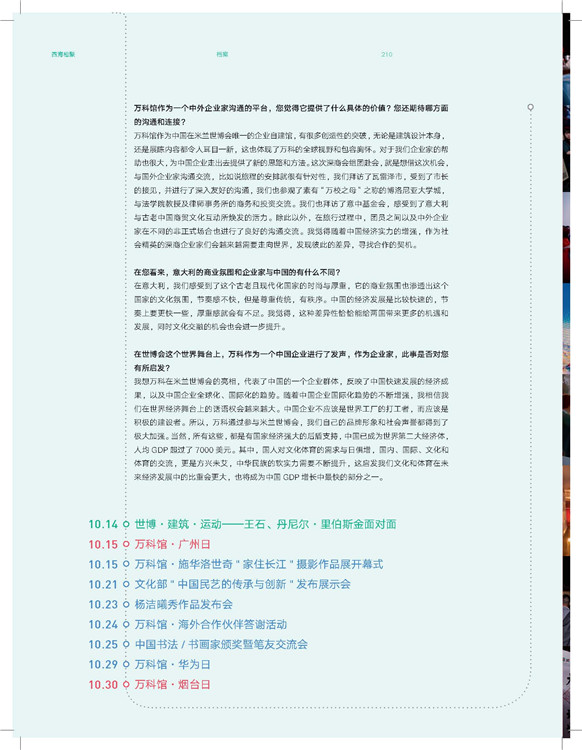 全书以时间为主线,依照场馆的筹备、规划、设计、建造、运营以及后世博遗产的文件保护计划这一进程分为6个部分。共有十余位主创人员记录了每一个阶段的心路历程:灵感碰撞、矛盾激发、方案升级、圆满落成,以至于情绪的波动也都有细微呈现。使读者能够身临其境地参与到一个巨大项目从筹备到落实的跌宕起伏。每一部分的档案环节还摘有具体的规划图、设计图、施工图、流程图等,更能深度解密万科馆这条“中国龙”的前世今生。万科馆是中外企业界乃至城市间密切交流的桥梁与纽带,促进了中意两国文化、经济和商业等各领域的交流,向世界展示了当代中国的精神风貌和当代中国人的生活面貌。后世博遗产的“龙•计划”也为文物保护工作开拓了新的思路。