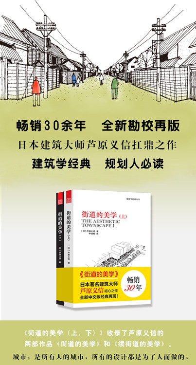 街道的美学(上、下)收录了日本著名建筑大师芦原义信的两部作品《街道的美学》和《续街道的美学》。文字都通俗易懂,作者把自己的理论用于了自己的建筑创作中,很有说服力。书中作者分析了外部空间,街道、景观、住宅等,结合大量的实例。其中传达着一个中心思想就是:城市,是所有人的城市,所有的设计都是为了人而做的。如同很多日本建筑师一样,芦原义信强调对人文精神的把握。