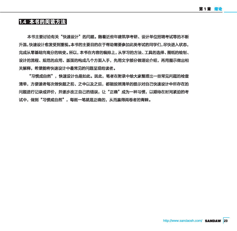 本书主要分为七部分,从易到难地介绍了快速设计的特点与学习方法、技术性图纸的表达要点、快速设计的思维训练及实际题目的解析与点评、常见问题的解答等,循序渐进地对快速设计进行了系统化、逻辑化的总结与归纳。