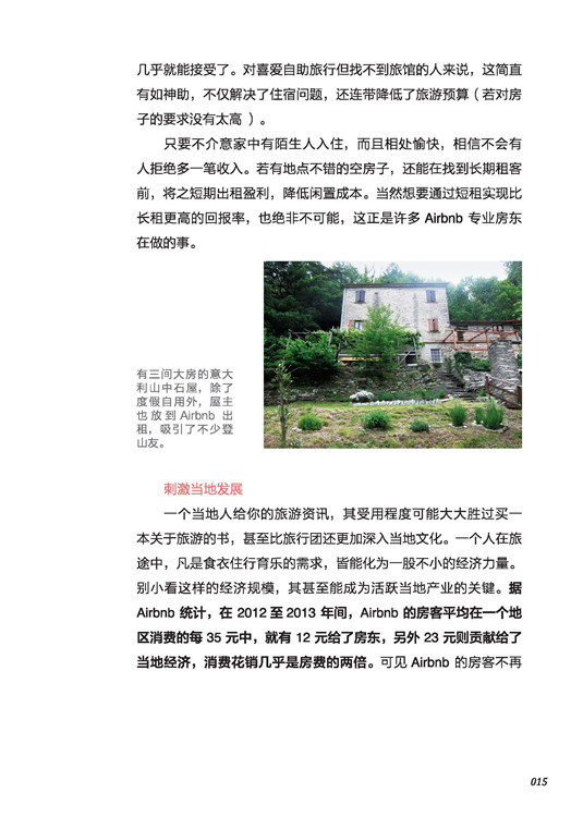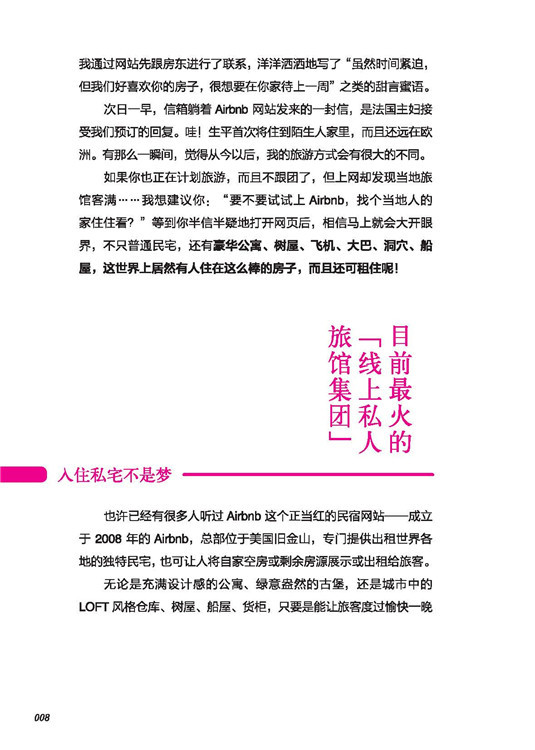 本书详细的介绍了作者使用Airbnb入住全世界陌生人家里的情况,重点介绍了Airbnb平台的使用方法,和陌生人家的入住体验,详细的介绍了自己利用Airbnb的省钱方式和其中遇到的陷阱,有利于其他使用Airbnb的人进行借鉴。后半部分还介绍了如何使用Airbnb平台出租自己房子的步骤,想赚外快的读者非常值得借鉴。