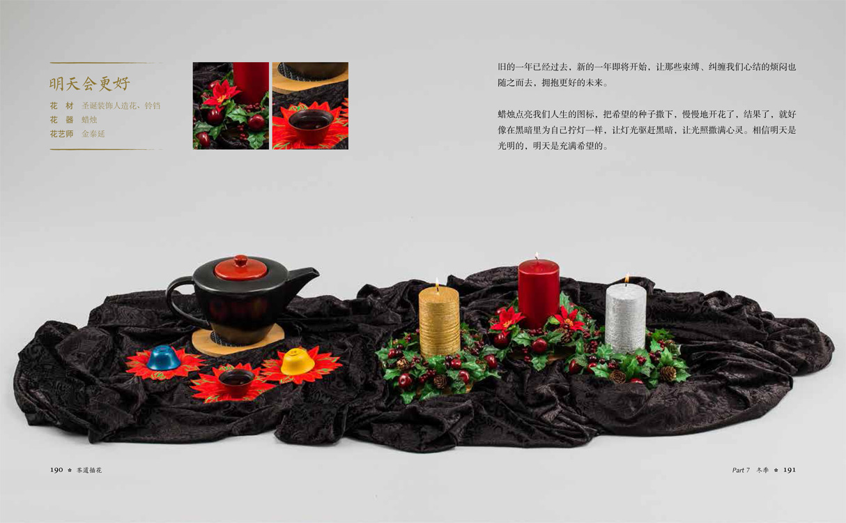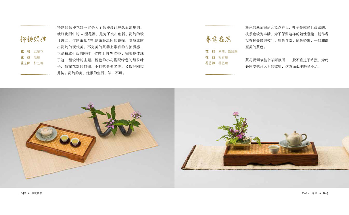 全书的内容含括茶花的特点和美学特征、茶道插花的基本原则、花材和花器的选择等,并根据春、夏、秋、冬四个季节进行划分,收录了100多个茶席插花的作品,每个作品里面含括花材、花器以及设计特点等文字,方便读者在进行茶室装点、品尝茶水的同时,选择合适的器具,并由此美化我们的生活空间,提升大众的艺术品位。