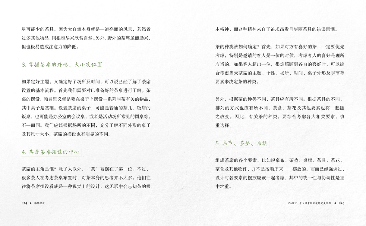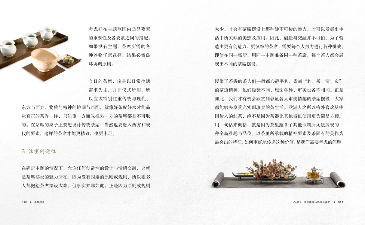 在这本传播传统文化的作品面前,我们一度为书中华美而有格调的茶席设计叹为观止。除了可以欣赏到绿茶、红茶、青茶、花茶和普洱茶等各种精心摆设好的茶席之作外,还能欣赏到雅致的茶室、桌越的器物和丰富的茶艺。遵循传统,但不停止追求全新的尝试,希望此书能给世界浸染一抹茶香,这是我们追求的目标。如果能因此让世界多一点美好,这将是编辑的荣幸。