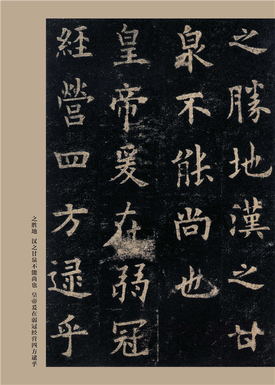 《九成宫醴泉铭》,于唐贞观六年(公元632年)立。碑位于陕西麟游县新城南九成宫遗址。传世拓本很多,以明驸马李琪所藏北宋拓本为最佳。其字最见神采,谨严中率意灵动,规矩中别具一格,如深山道人,瘦硬清寒,而神气充腴。笔画粗细变化中饱含精妙的笔法,布势极尽参差,更显示了化险为夷的艺术匠心。《九成宫醴泉铭》可以说是初唐时期楷书作品中一件划时代的杰作,从风格构成上讲,既有篆、隶的笔意,又有晋、魏的遗风。兼方带圆的用笔特式,结构搭配平正而险绝,由此也可以看出欧阳询在书法史上“上承六朝北碑之余韵,下开唐代楷体之先河”的历史贡献。