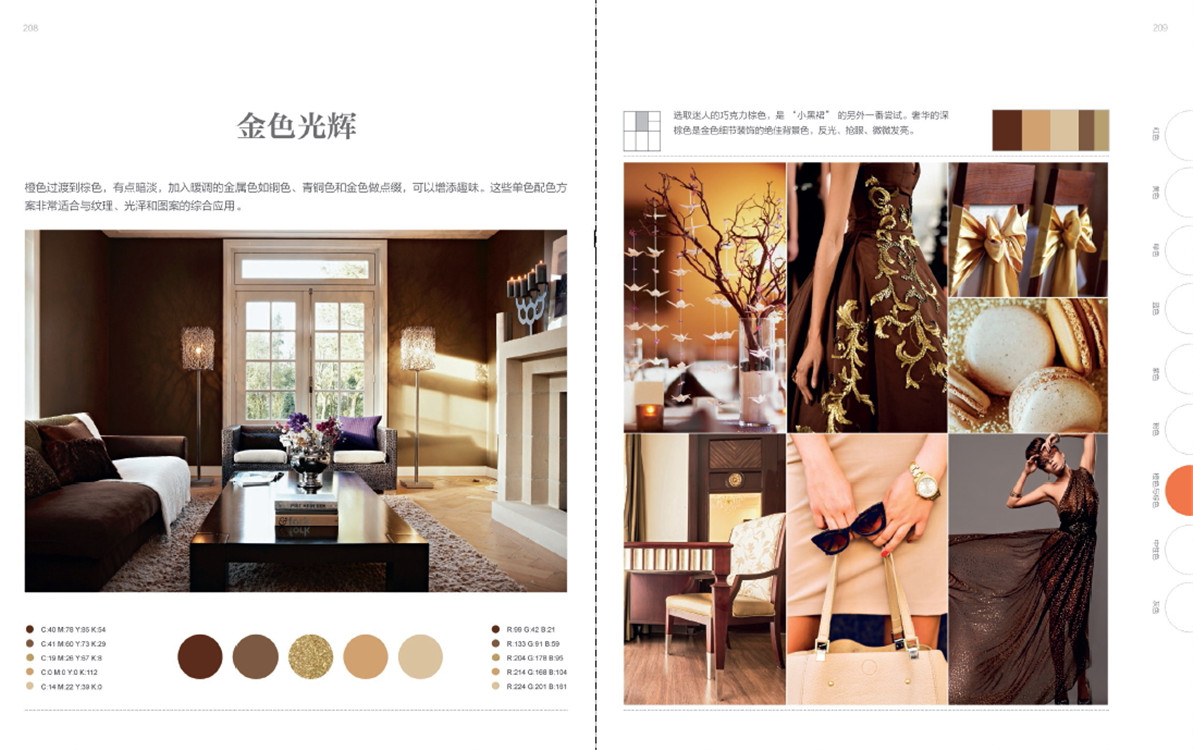 本书是美国旧金山知名室内设计师珍妮弗·奥特的新作,有针对性地选取了9大色系共125个配色方案,不仅介绍了实用的色彩搭配范围和法则,而且阐述了不同的色彩搭配所代表的文化内涵和所营造的格调氛围等,配色方案涵盖范围相当广泛,包括家居装饰、婚礼庆典、形象配饰、蛋糕装饰等方面。书中文字生动且贴切,选用“天空中的太阳”“彩虹之上”“夏季向日葵”“暗色迷迭香”“水漾清波”等富有诗意的词语为色彩添上点睛之笔。精美的图片结合CMYK、RGB色值及配色比例,使配色方案丰富且实用,将知识性、实用性、收藏性集于一身,为广大色彩爱好者及室内设计师、平面设计师带来丰富的灵感启发,具有很高的借鉴及参考价值。