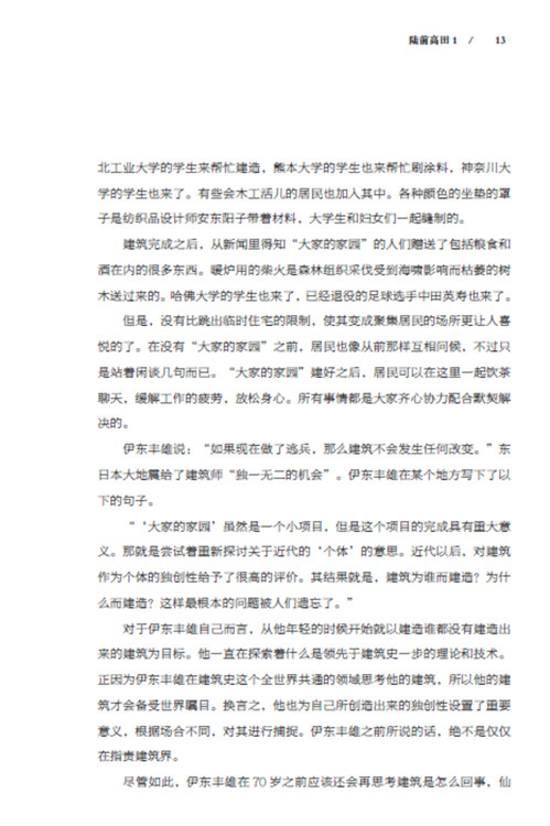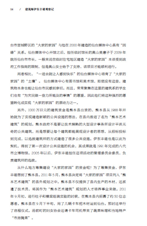 在书中,伊东丰雄说:“人们聚集在盛开的樱花树下,用帷幕围起来,我想,那不就是建筑吗?”他以充满了乐观,轻盈及喜悦,又同时具备独特性与普遍性的建筑作品告诉我们,建筑必须回归人性。