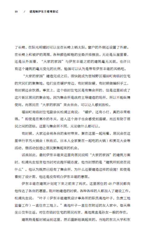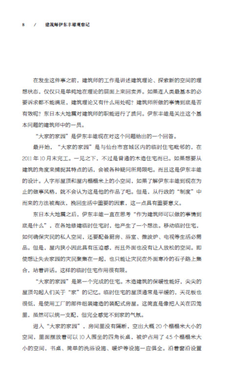 这本书是对伊东丰雄的建筑设计各个时期的所行所思的一次平实而深刻的回顾。对于建筑设计感兴趣的人们,通过这本书可以深入了解这位现代建筑巨匠的真实从业历程和思想。