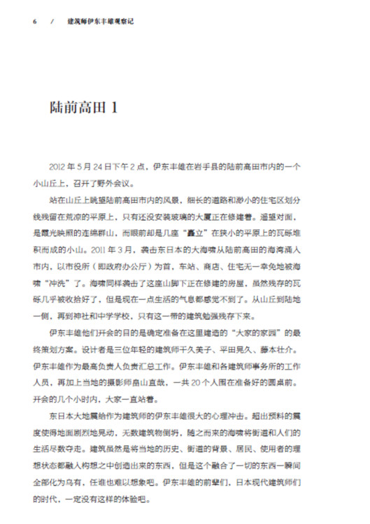 本书是对普利策建筑奖得主、日本建筑大师伊东丰雄生活、工作的观察记录。书中收录了伊东丰雄在智利、新加坡、巴黎、陆前高田市、京都、东京、八代市等城市的生活轨迹,并详细讲述了他在当地设计的项目时的思考模式和构思散发点。同时还记述了其学生时代、有志成为建筑师因而前往东京、20世纪70年代成为建筑师、设立建筑事务所等建筑生涯中的各个时期。