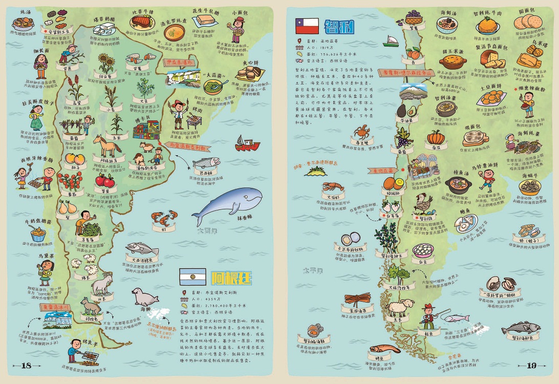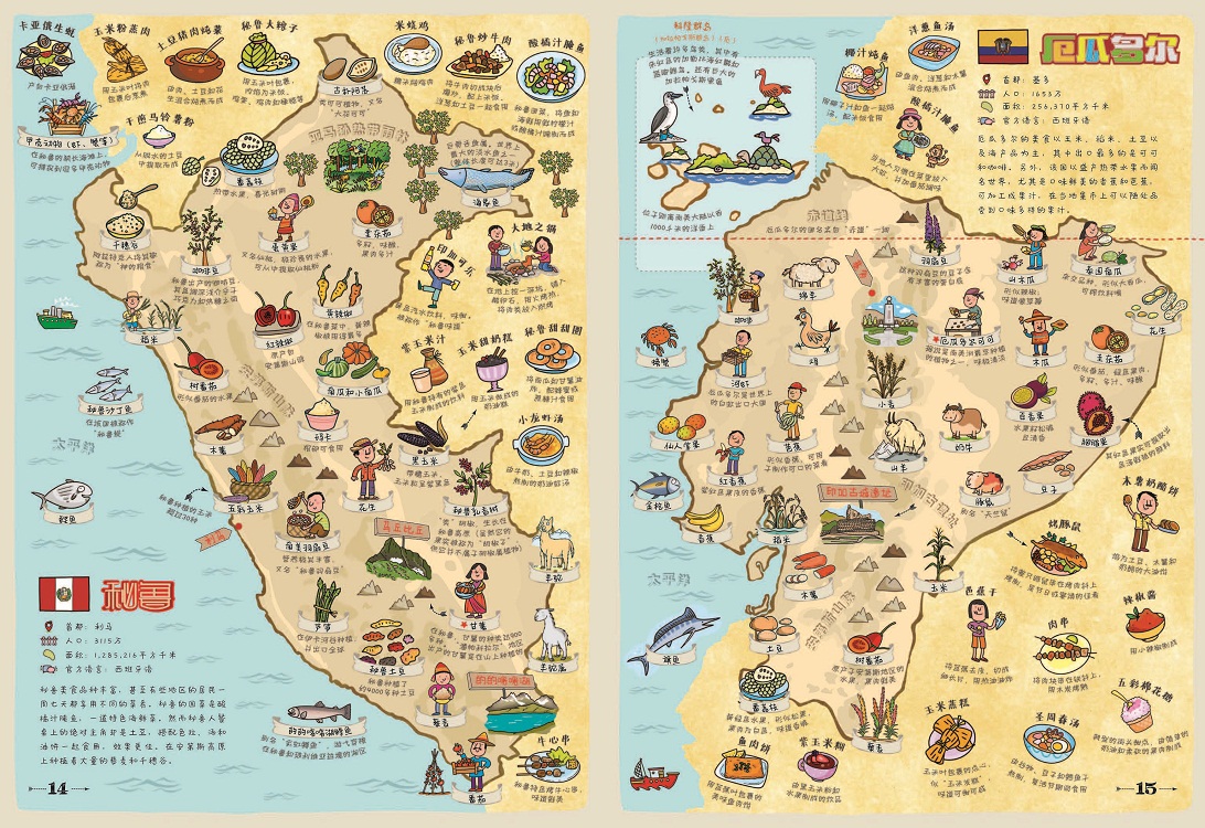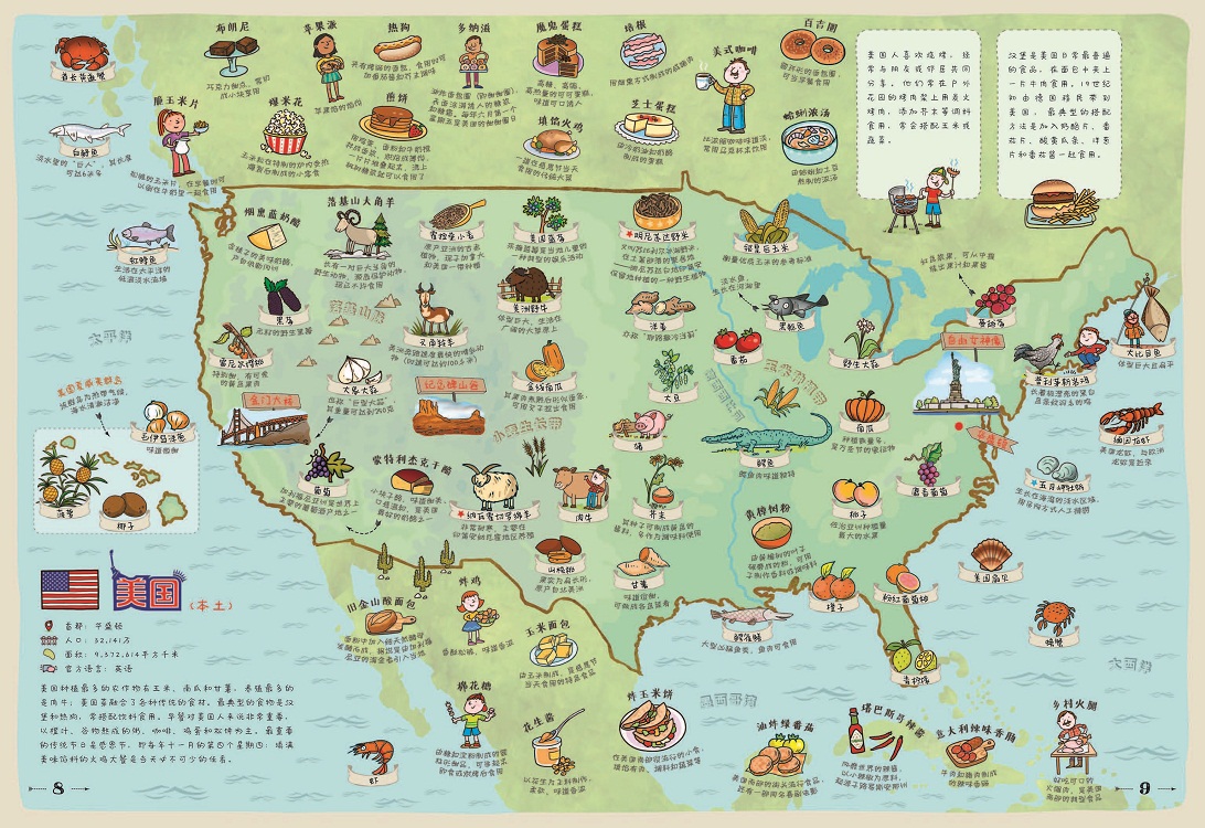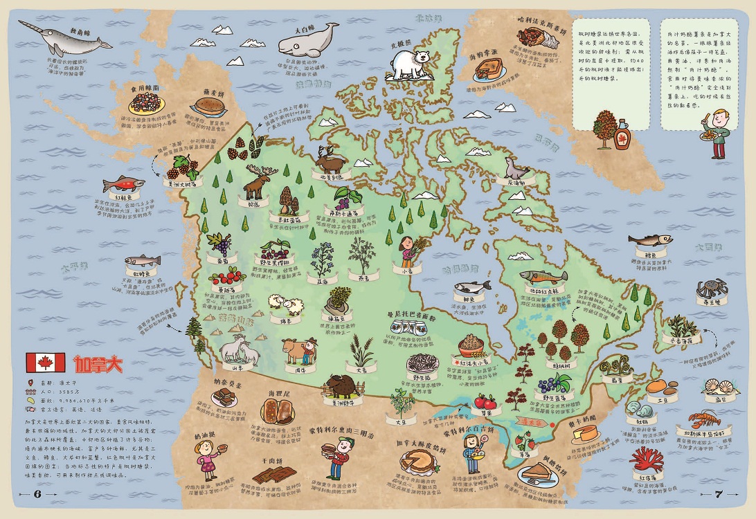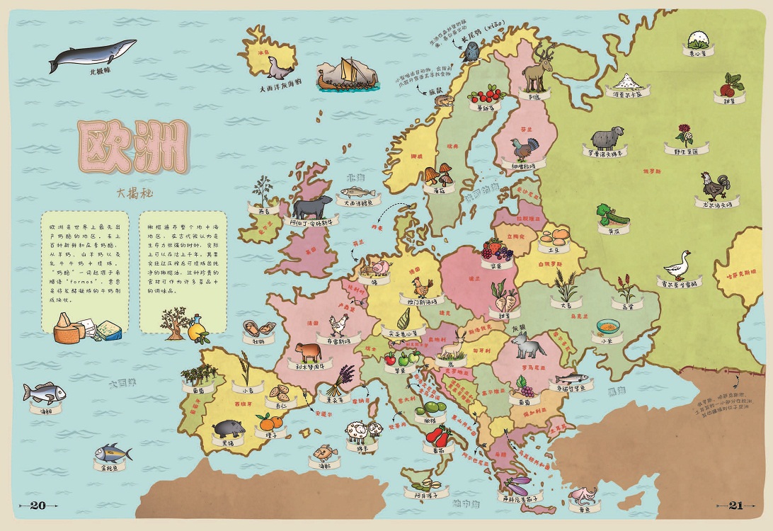 本书中食物地图介绍了全球部分国家或地区的农作物、动物、土特产及独特的美食配方。动物、植物会打破国与国之间的划分界线,你还会发现独特的美食是除国界线外,区分国与国之间的更具代表性的事物。