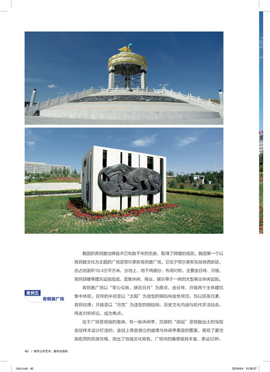 公共艺术的概念与界限非常广泛,城市雕塑、壁画、公园、商业街区等皆包含其内。公共艺术体现了城市的形象、品牌、文化,城市人文复兴、创新科学的规划、市民生活、城市民主与和谐皆离不开公共艺术。公共艺术似乎有些姗姗来迟,但自进入中国社会后,它也参与到了中国城市建设的方方面面。随着中国申奥成功,“鸟巢”“水立方”等大型公共设施也随之落成,其创新、拟态的外观和多功能的复杂结构同时满足审美和实用两方面的需求,体现了时代感与中国的大国精神,成为国际公共艺术上耀眼的一章,也为奥运会增添了绚烂的一笔。