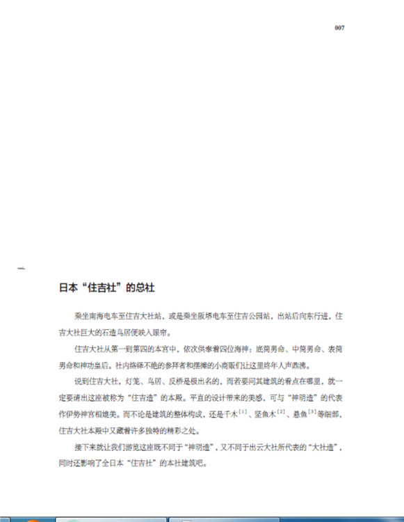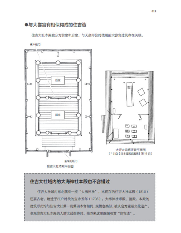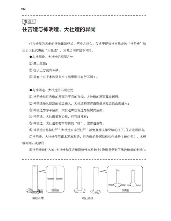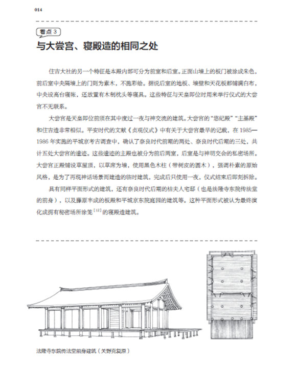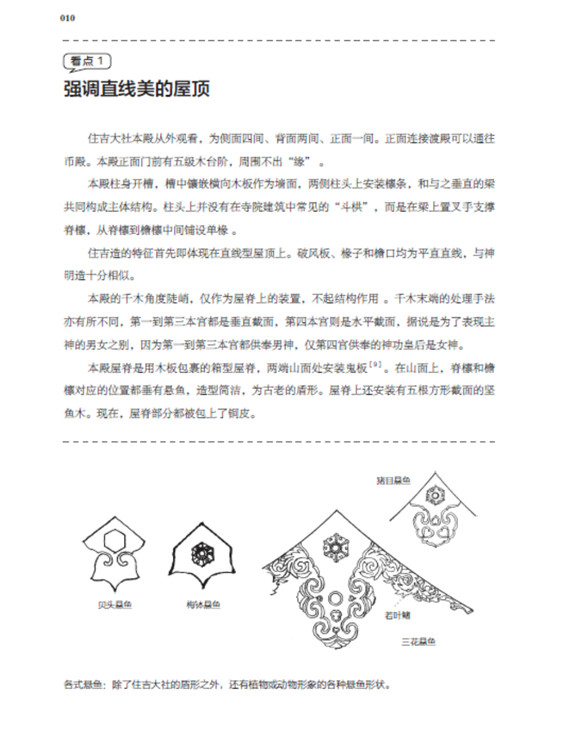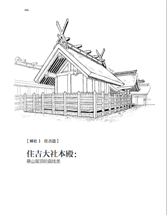 本书将日本古建筑中的神社、寺院、书院三部分,按照建筑样式细分成住吉造、春日造、流造、日吉造、八坂造、飞鸟样式、和式、大佛样、禅宗样、折中样等14种建筑样式在住吉大社本殿,领略悬山屋顶的直线美