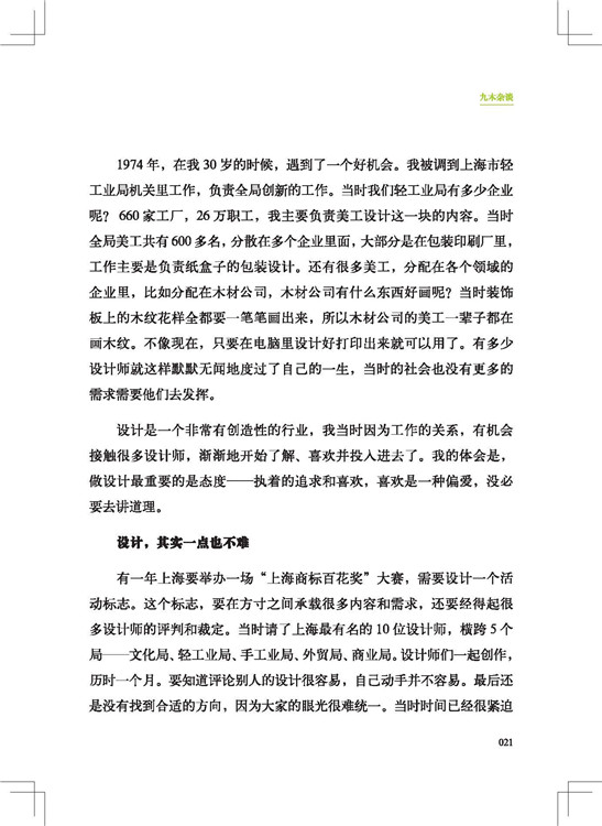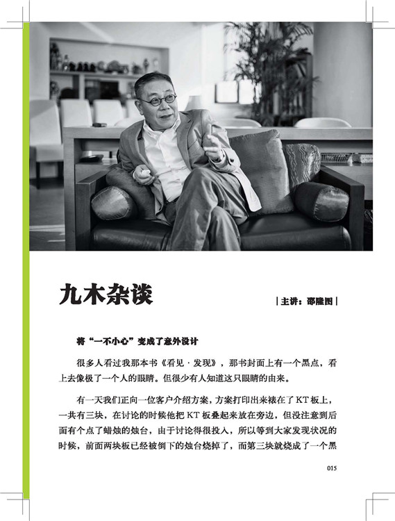 这本书以访谈形式来分享作者职业生涯中的设计项目经验,讲解其亲身经历的大项目过程,展示其几十年总结的独有的创意观。通过十个话题来讲述设计师对平面设计、产品设计以及室内设计的理解与感受,以及用户的体验态度。并深入浅出地道出设计的理念,直击设计的本质。这也是树立品牌形象,传播品牌影响力,积累品牌资产的核心要素。同时作者还提到了创造性思维在设计中的重要性,这种思维模式不仅给设计师灵感与启发,同时也给用户满意的体验与享受。