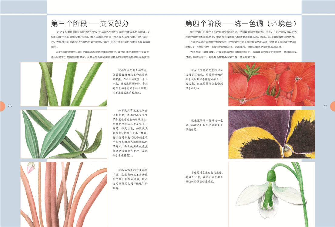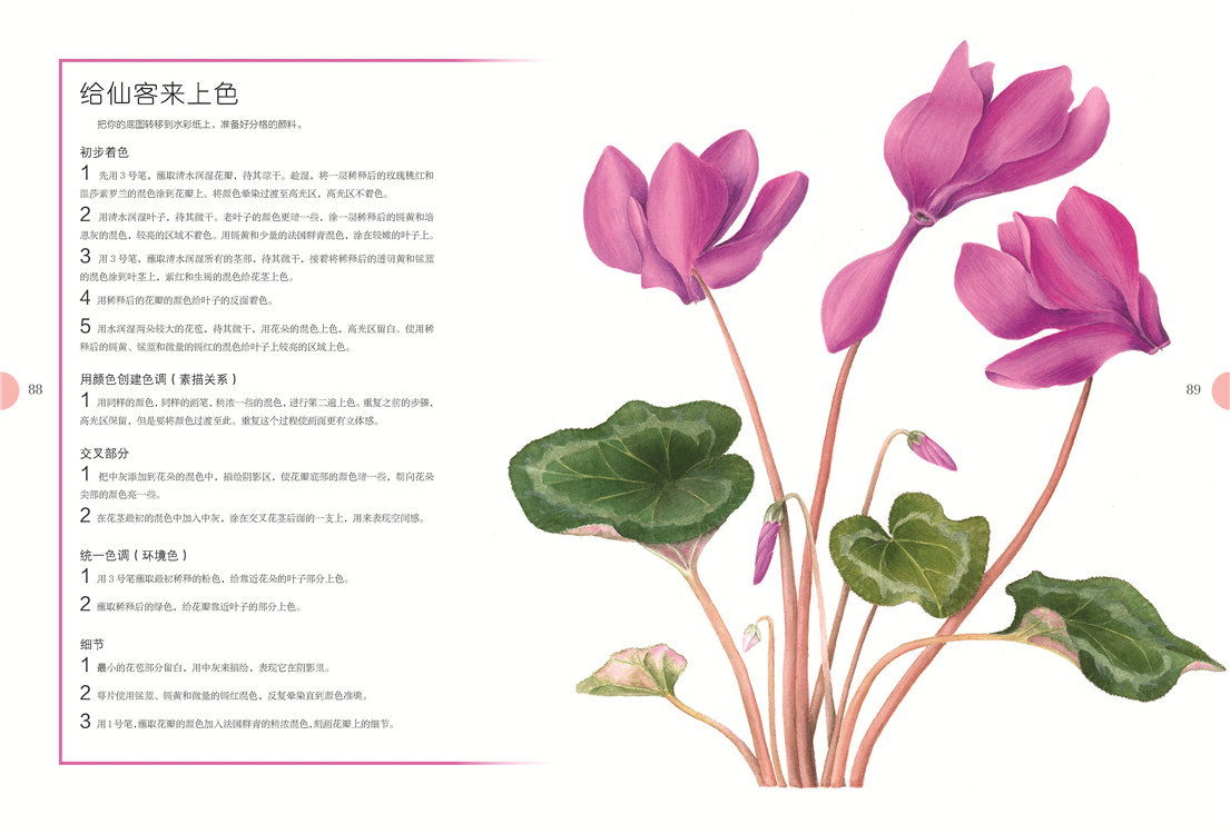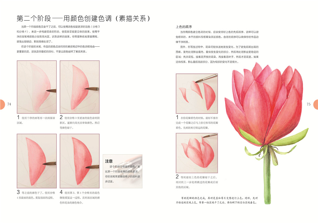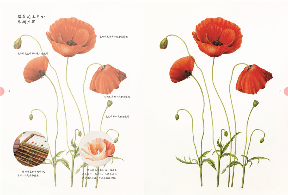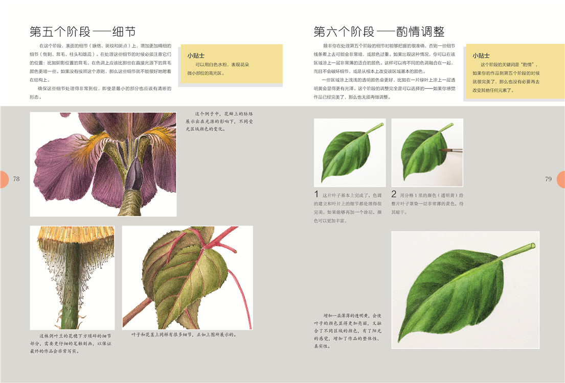 必备的画前准备后,是艺术家对造型和设色的讲解,扫除你的入门疑虑。之后出场的是有充分详解步骤的绘画案例,玫瑰、马蹄莲、鸢尾……你肯定会喜欢。充分的练习后,需要反思总结,艺术家在这里列出上色的六个阶段,这有助于你更精准地使用颜料,帮你走向真正的植物绘画。