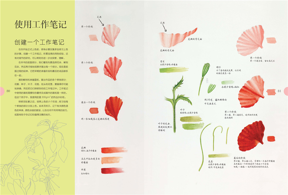 有一点要说明,水彩花卉在开始正式上色前,很有必要反复多加练习上色的步骤。创建一个工作笔记,积累宝贵的颜色经验,还有对细节的研究,可以帮助你去进一步探索、理解。例如,记下有关颜色的种类,颜色图层的数量,以及任何不同寻常的技巧,或是有助于你记忆和值得注意的地方。这种方式在书中后半部分出现,初学者可以遵照同样的方式创建专属于你自己的视觉笔记。