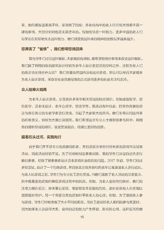 本书的第一部分收录了多位专家学者及参赛者从各自的角度出发,为乐龄游戏设计撰写的文章,分享其各自宝贵的知识和经验,为读者提供启发。