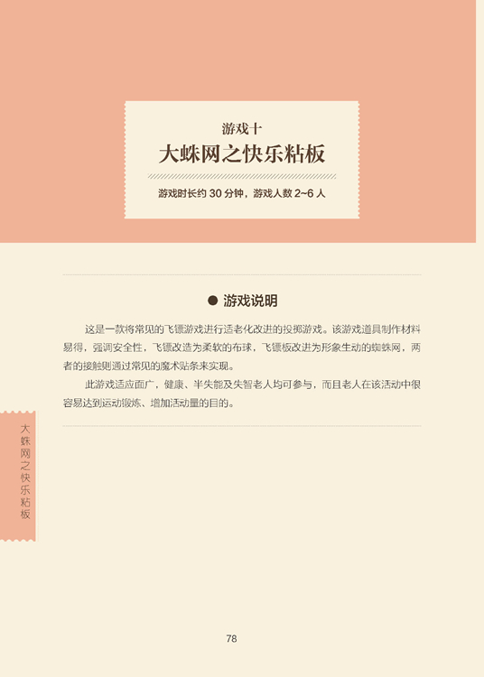 第二部分收录了本届游戏大赛的十二个获奖游戏作品,内容丰富多样。既有动脑的,又有活动健身的;既有一两人进行的,又有团体的;既有三五分钟一局的小游戏,又有近一个小时的较复杂游戏;但共同的特点是简单易行,道具随手可得,一般健康老人均可参加,适当兼顾半失能、失智老人。对于不同难易度的游戏,读者在应用时还可以自己发挥创意加以改造,切实地为老人带去快乐。