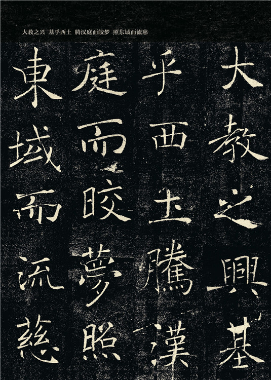 “S” 形运笔是《雁塔圣教序》的一个典型特征。而其小竖,尤其是左竖,波浪形尤为明显,达到了弧线摆动之极致,整体表现出一种柔韧之美。但是,不可徒书其形。这种S形势只在部分字中出现,因其独特,故印象深刻。临习时,应结合其他笔画的自然衔接为根本。全篇每字落笔处往往不是虚入,而是重按而行,形成一种大胆落笔、大胆收拾之势。为用笔轻重先行准备了一个变化起点,由重至轻,从而使用笔非常丰富,且有成竹在胸之意。