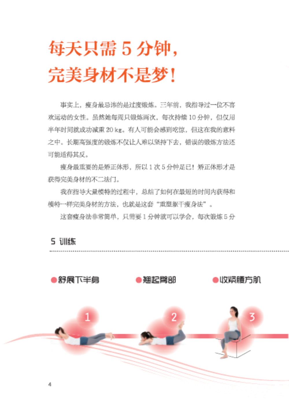 5个动作,坚持两周,不需要挥汗如雨,就能有效解决骨盆前倾、小腹前凸、小腹赘肉、蝴蝶袖等瘦身难题。6大秘诀,帮助读者解答瘦身遇到的各种难题,轻松增加能量消耗,减掉顽固肌肉,养成保持身材的饮食秘诀,让你生活不规律也能瘦身。3大专栏讲解,助你避免瘦身误区,避免越减越胖,科学瘦身。7大妙招助你跨越瘦身的瓶颈期,实现不反弹,塑造完美身材。简单实用,具备极强的可实践性,让看似复杂的瘦身塑形变得一目了然,简单易学,让你轻松实现完美身材。