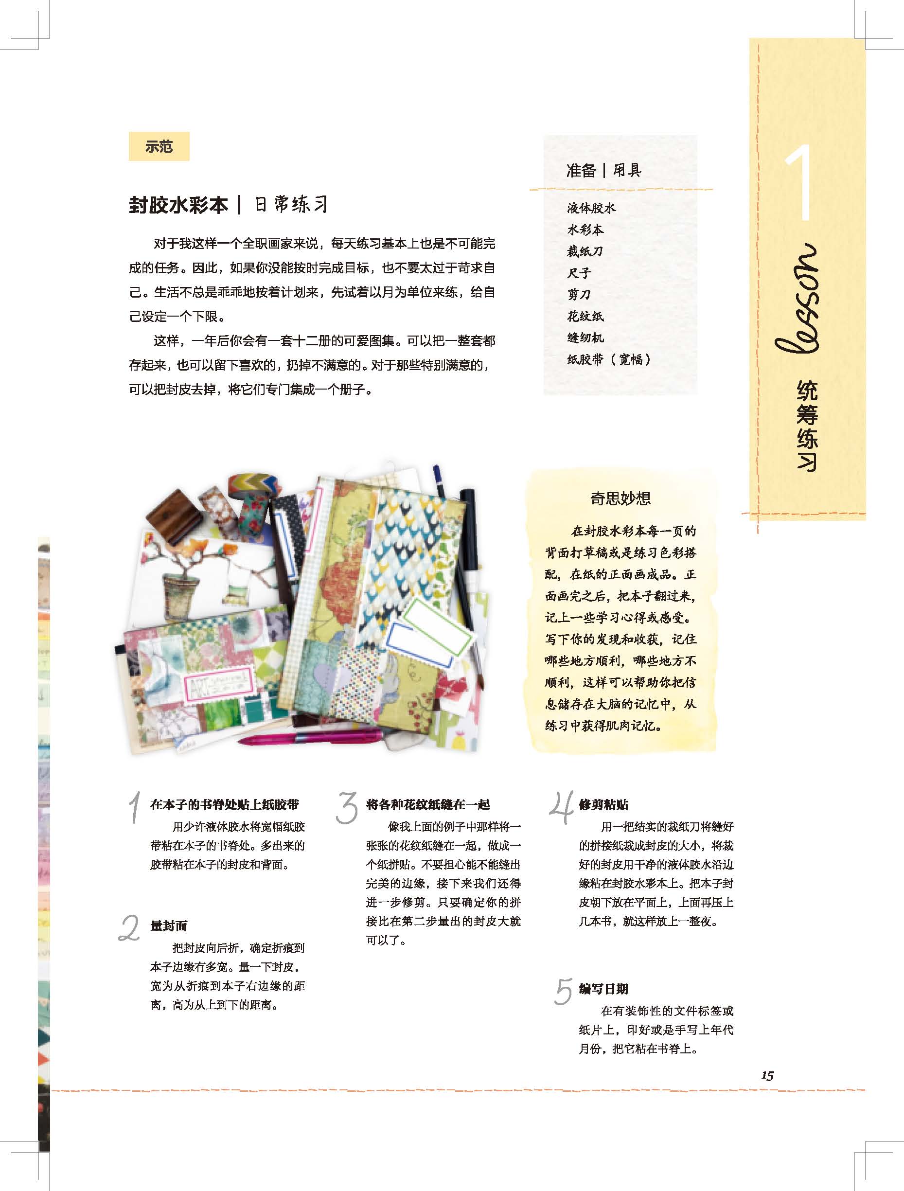 丹妮尔·唐纳森是一位热爱奇思妙想的艺术家,但并不放纵恣肆。你可以在书中感受到她自律又自由的个性。这对初学水彩的爱好者来说实在太棒了!她为我们编著的这本《少女心的水彩日记》值得反复研究玩耍,书中从工具的统筹准备开始,系统讲述了为了不同目标的练习你需要做的事,比如封胶水彩本用于日常练习,创意练习本用于色彩练习……她创造的打卡练习系统最终汇成你在水彩学习之路上的一本本“故事书”。而且让人惊喜的是,丹妮尔会利用拼布,蕾丝,各种小零碎作为创作灵感进行创作,其中的小心思她都毫无保留地告诉了我们。