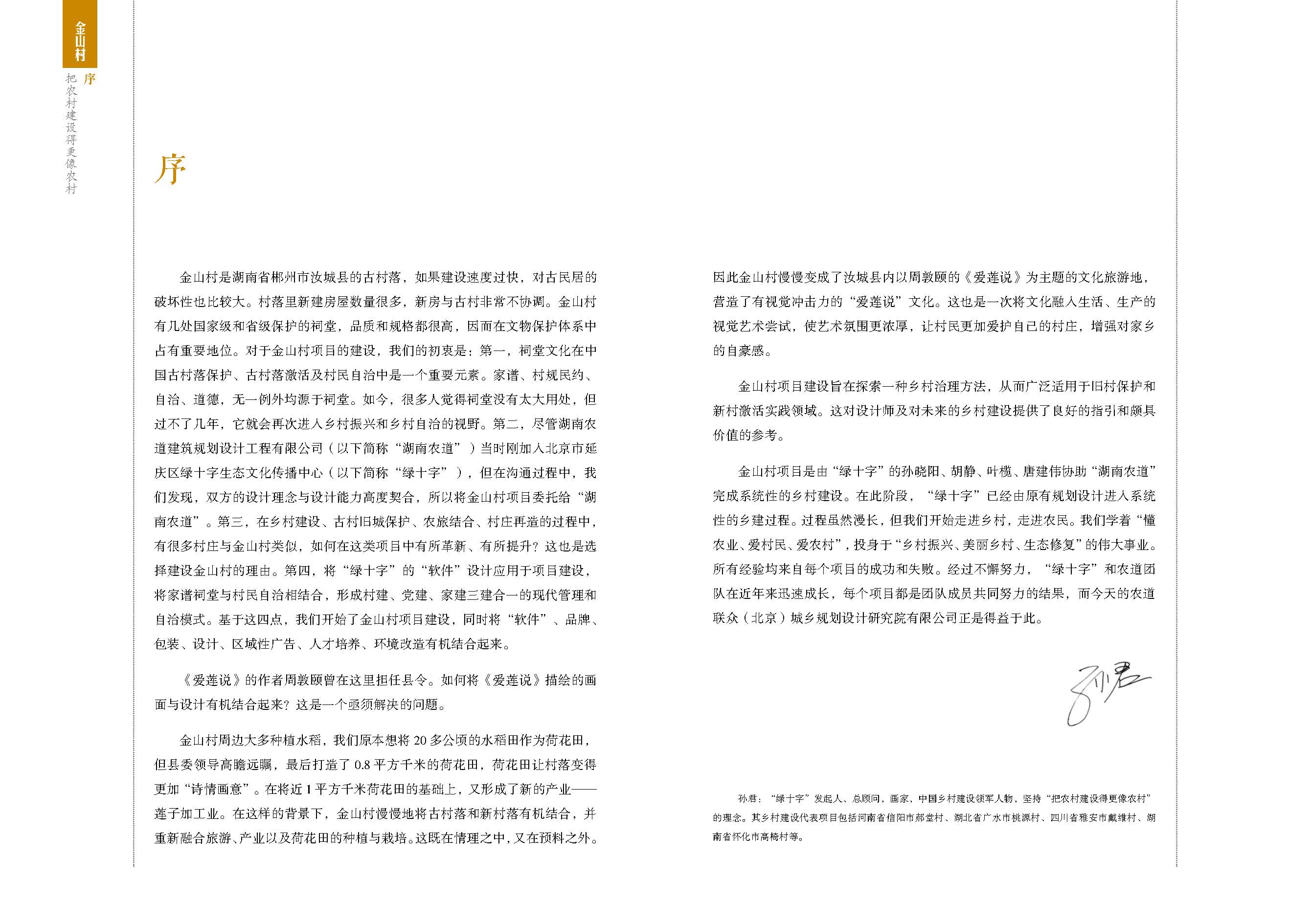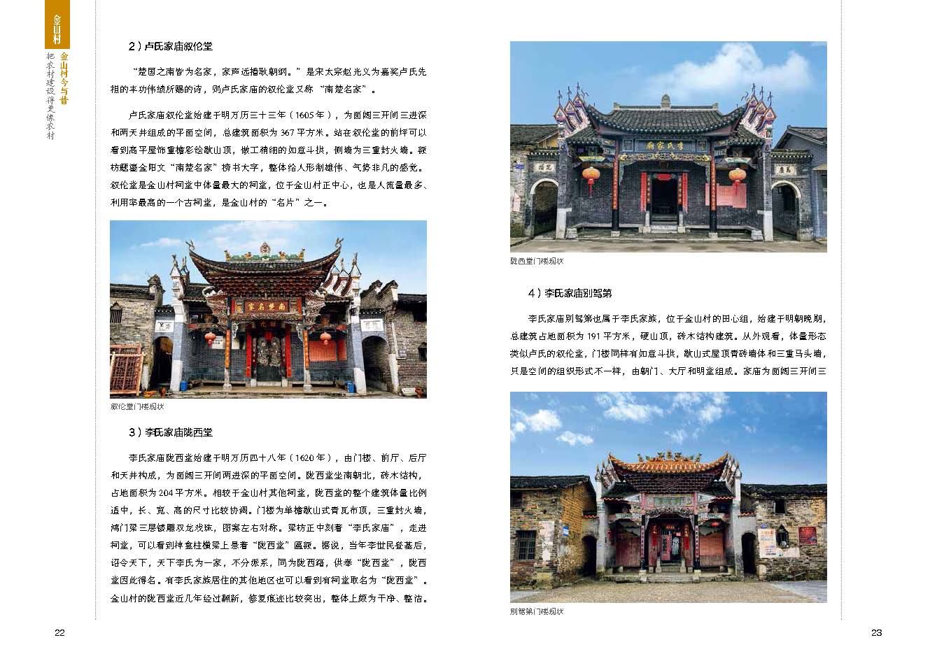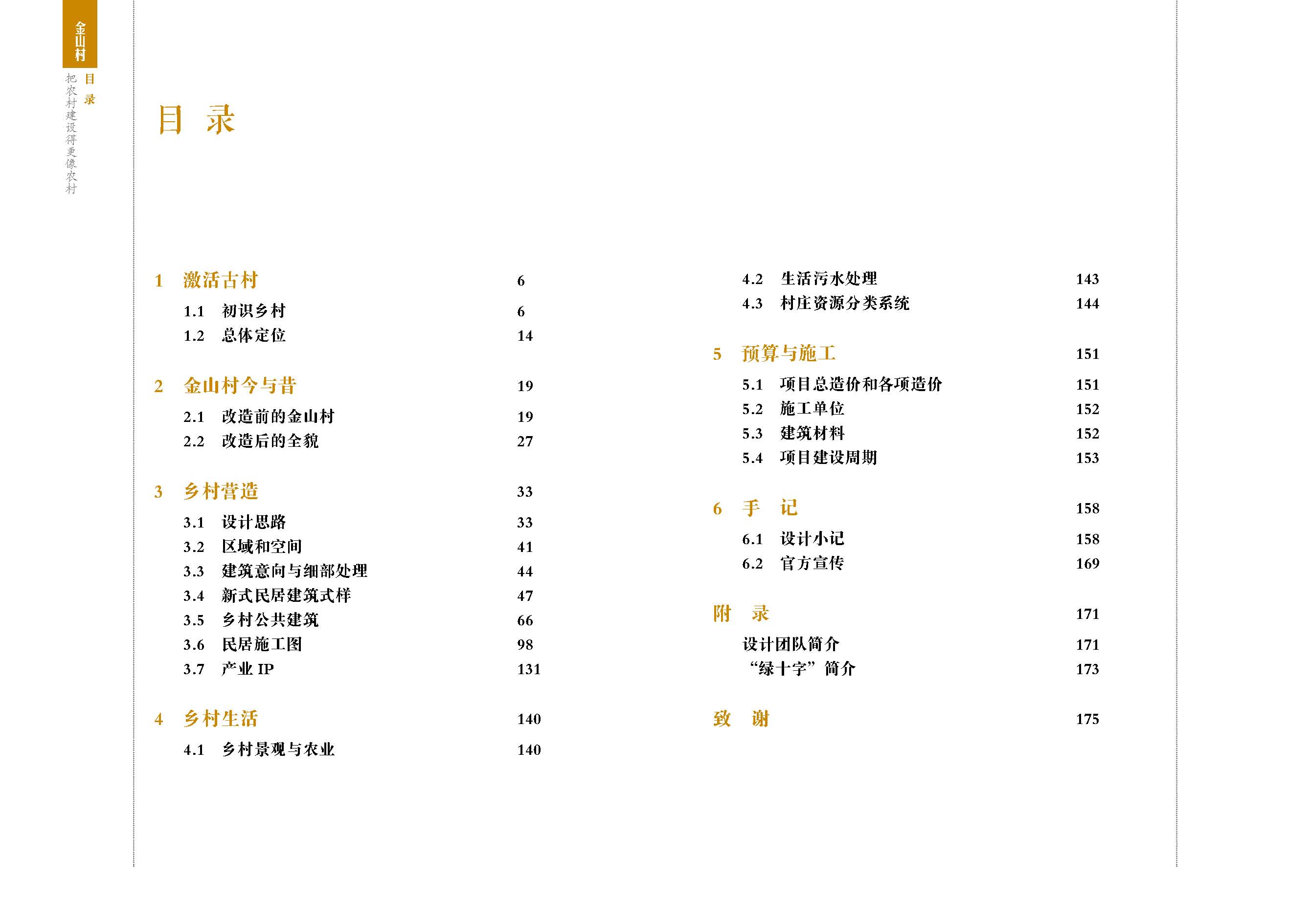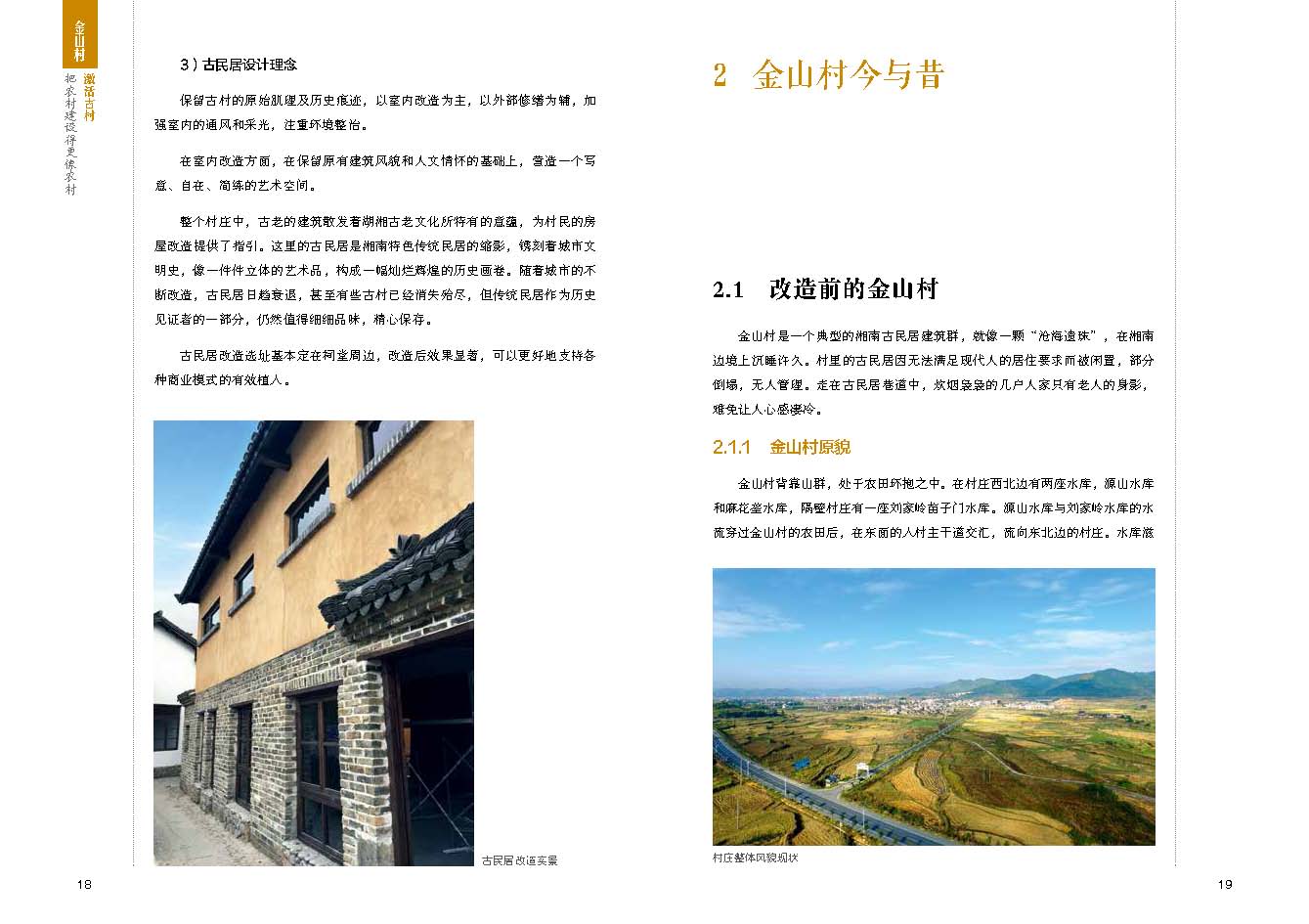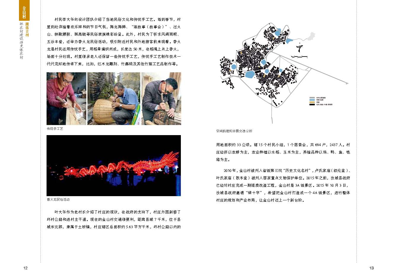 金山村位于湖南省汝城县,是拥有几处国家级和省级祠堂的古村落,有着典型的农村村落特征和祠堂保护的特殊性。设计师从祠堂的修复与保护作为切入点,设计莲花草堂、荷塘景观、村头招呼站、戏台等标志性景观。书中通过实景前后对比图片、设计图纸、模型方案、灯光效果图、手绘图等,让读者不仅能通过文字,还可通过图片来深入了解金山村建设前后的巨大变化。
