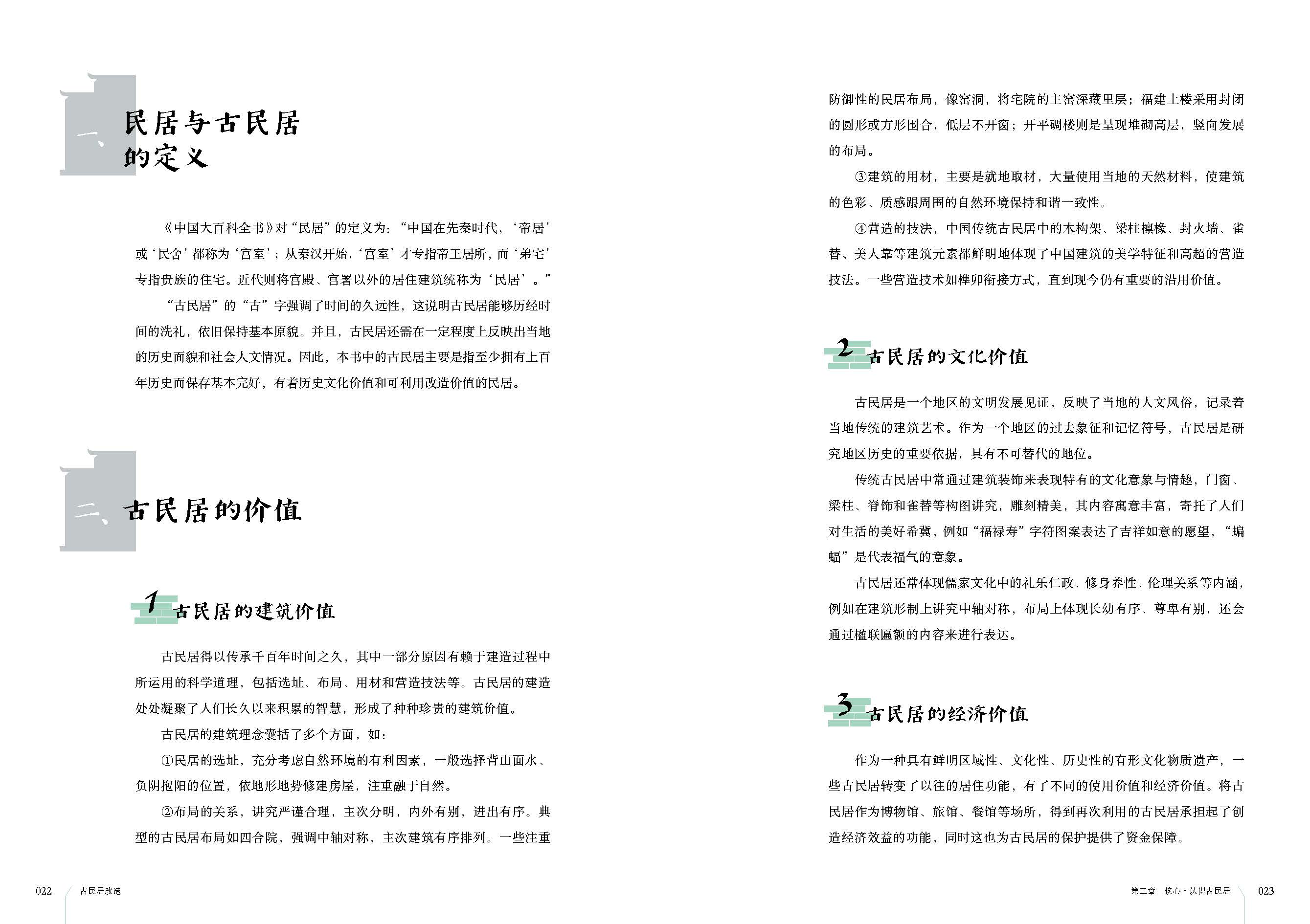 全书共三章,主要从两大部分来阐释古民居改造,一是关于古民居的基本知识,包括古民居的相关概念、保护思想和改造原则等,还简要记录了国内不同地区的古民居之特征,让读者对古民居有大致系统性的认识;二是关于古民居改造实例的解析,选择了七大古老民宅的改造故事,讲述了它们的前世今生,致力于挖掘建筑本身的历史渊源和旧记忆,并结合实际可行的图纸,通过各种保护修复与改造的措施,把它们转变成酒店、会所、民宿等有价值的再利用空间,将旧时光复刻在人们眼前。改造实例中还附有大量的精美实景图,也有各种施工细部的详细讲解,能给予读者带来启发性的思考。
